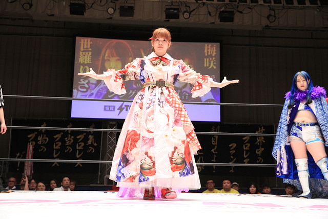 梅咲がガウンを脱ぐと、右肩にはテーピング。観客席からはざわめきが起こるが、かき消すように梅咲の先制攻撃。鮮やかなドロップキックで世羅を蹴落とすといきなりの場外ダイブ!復帰を待ちわびていたファンに元気な姿を見せた。だが、世羅が梅咲の右肩を容赦なく攻めると試合の流れは一変。あの手この手で、反則や凶器攻撃も交えながら梅咲の肩をしつこく狙う世羅。梅咲の右腕をロープにかけ、右肩めがけてバックエルボー。思わず倒れた梅咲だったが、センターの意地でエルボーを打つ。さらにランニングネックブリーカー、フットスタンプ、ブレーンバスター、ドロップキックと攻勢に。しかし攻めてはいても痛みをこらえる梅咲。世羅はまだまだ負傷箇所をいたぶり、エアーズロックIIでフォール。意地でカウント1で返した梅咲はカウンターのキューティースペシャル。梅咲がエルボーを打っても本来の力はなく、世羅は笑みを浮かべる。世羅がワンツーエルボーを打つと、いよいよ火が付いた梅咲はローリングエルボーで世羅をふらつかせ、渾身のエルボーで倒すと追撃の梅スプラッシュ。2で返されるとラ・マヒストラルや逆さ抑え込みで丸め込んでいくが、世羅は巧みに切り返し、キックアウトする。ジャーマンスープレックスは返され、ブラストは封じられ、いよいよピンチの梅咲。それでも痛む腕でエルボーを打ち続け、最後まで諦めない姿勢を貫いたが、羅紗鋏からダイビングWニードロップを被弾し力尽く。全く動けないまま試合終了のゴングを聞いた。絶対センター復活祭は敗戦に終わり、外敵王者の防衛を許してしまう。