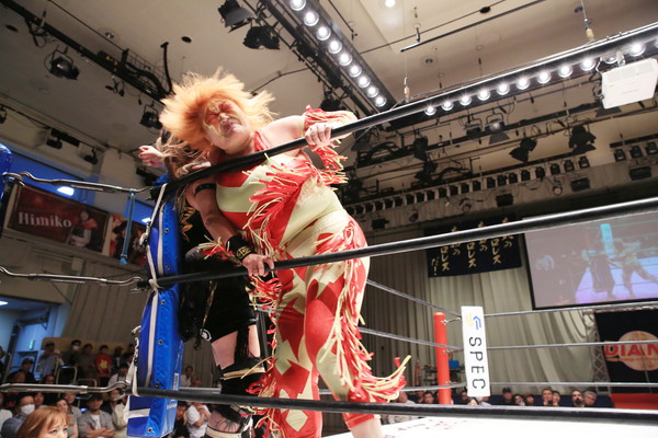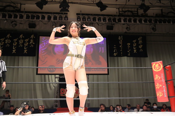 シャンシャンは葉月の思いに応えるように、その白いコスチュームを着用してリングイン。まずはシャンシャンが連続ドロップキックにエルボー乱れ打ちで先制攻撃。しかし葉月がお返しのドロップキック一発でシャンシャンを吹っ飛ばす。早くも力の差を見せつける葉月は、ファンの手拍子を煽りながらボディスラム、セントーン、ヘアホイップと連続攻撃。そして得意の顔面ウォッシュに逆エビ固めと勢いが止まらない。シャンシャンがロープに手を伸ばすと、リング中央へ引きずる葉月。命からがらエスケープしたシャンシャンを嘲笑うかのように顔面に蹴りを入れる葉月はまだまだ余裕の表情だ。シャンシャンがエルボーを打っても「効かねーぞ!」。劣勢のシャンシャンは葉月の突進をブリッジでかわすと、スタナーやランニングネックブリーカーに鎌固めと反撃開始。ロープを掴んだ葉月に追撃の低空ドロップキックを浴びせる。シャンシャンがしつこく押さえ込んでいくが葉月は全てキックアウトし、クロスフェイスロックで捕獲。シャンシャンがロープに辿り着いてもなかなかクラッチを解かない葉月。反則カウント4でようやく解除すると、間髪入れずダイビングセントーン。シャンシャンがこのフォールを返すと、手応えを感じた葉月は笑顔。もう一発セントーンを落とした葉月だったが、これはシャンシャンが回避し逆襲のミサイルキック。続くトルネードDDTや美しいブリッジのフィッシャーマンズスープレックスでフォールするも葉月の肩が上がる。葉月のクロスフェイスロックにまたも捕まり、強烈なビッグブーツをまともに食らいながら粘り続けるシャンシャン。連続の丸め込みで諦めずにフォールを取りに行くが試合巧者の葉月の牙城は崩せず。葉月が三度目のダイビングセントーンをコーナー最上段から発射し、勝負を決めた。シャンシャンのことはコスチュームしか知らなかった葉月だが、試合が終われば「めちゃくちゃいい選手でした。想像の何倍も思いっきりが良くて、試合しとって楽しかった」。葉月とシャンシャンの初遭遇は観客の大きな拍手に包まれながら幕を閉じた。