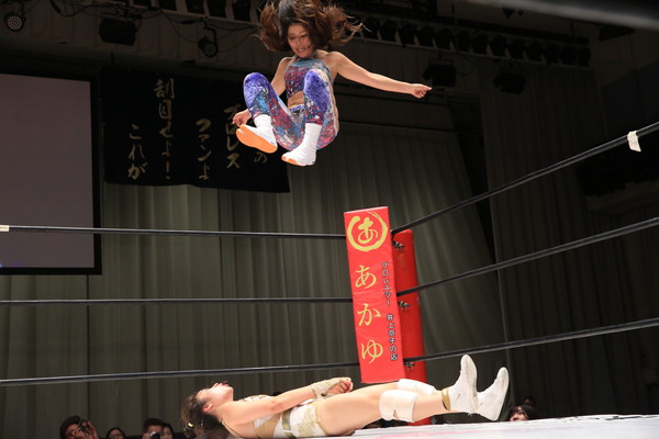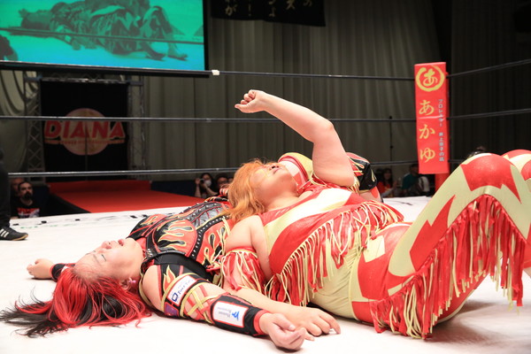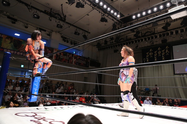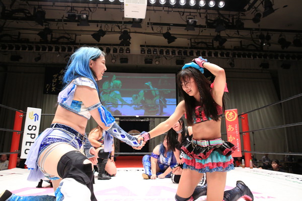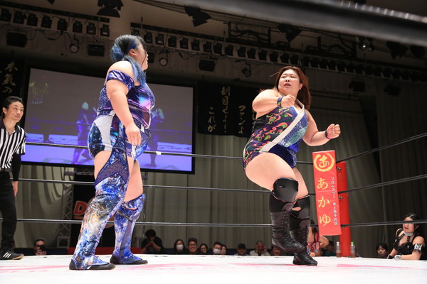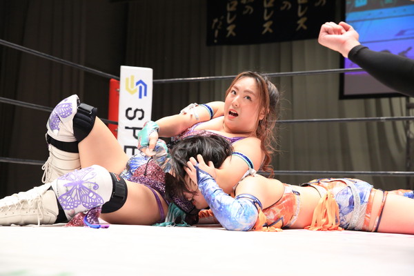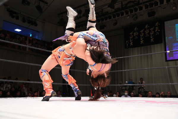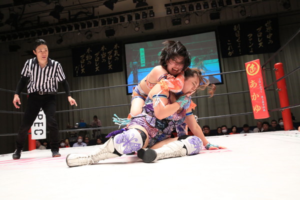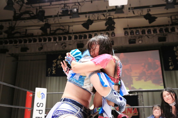 ゴングが鳴ると2人はいきなりタックル合戦に。両者倒れることなく持ちこたえ、お次はエルボーの打ち合いだ。そしてまたタックル。まなせはヘッドロックでナナミをしつこく絞り、ナナミが抵抗しても離さない。ようやく脱出したナナミにまなせがタックル。ナナミはエルボー。ナナミのボディスラムを許さないまなせがボディスラム、そしてしつこく押さえ込む。まなせが何度もフォールし、ナナミが何度も返す。ナナミが力いっぱいのボディスラムでまなせを叩きつけると観客は拍手喝采。2人のシンプルかつド迫力の攻防に大盛り上がりだ。ナナミはまたもまなせにタックル合戦を挑む。まなせは「倒れるか!」と意地を見せる。セコンドについた網倉理奈の「ナナミ!倒せ!」の声に背中を押され、ナナミは何度も何度もまなせに向かっていく。そしてロープの反動を使い、勢いよく突進した渾身の一撃でまなせをようやく吹っ飛ばす。ここからさらに勢いづくナナミはトップロープへ。しかしまなせも立ち上がってコーナー上の攻防に。まなせがヘッドバットでナナミの動きを止め、デッドリードライブで投げ落とす。そして拳を高々と突き上げて無言の勝利宣言だ。ナナミはまなせがラリアットで向かってくるのをスリーパーホールドでうまく捕まえ、胴締めもがっちり加えて絞め落としにかかる。まなせは落ちる前に足がロープに届いてブレイクし、ブレーンバスター。ナナミはタックルでなぎ倒し、裏投げ、もう一度タックル。死力を尽くす2人はWダウン状態に。そこから先に立ち上がったのはナナミだ。ノーザンライトスープレックスにダイビングボディプレス、そしてまたもタックル…が、これをまなせがカウンターのラリアットで迎撃。トドメはしっかり助走をつけた豪快なラリアット。大熱戦を制したのはまなせゆうなだ。戦いを通じて心が通い合った2人は、「夢見る少女じゃいられない」をBGMに握手を交わした。