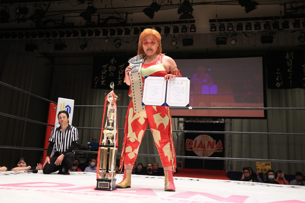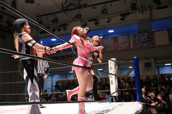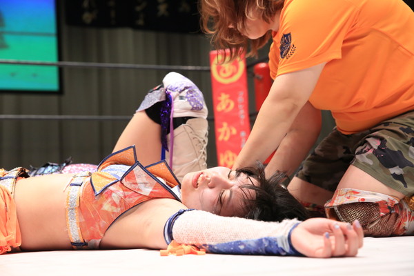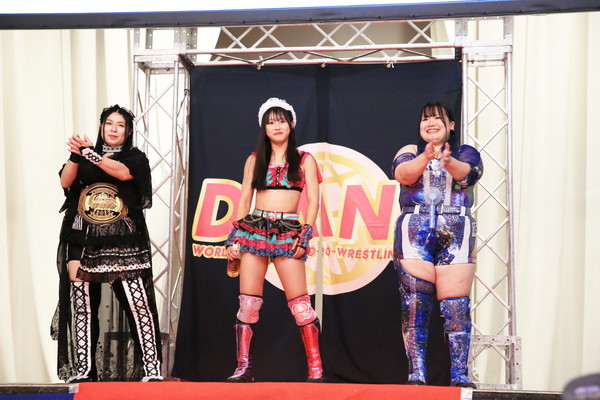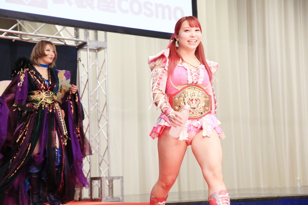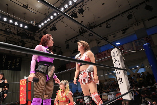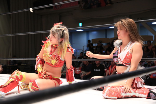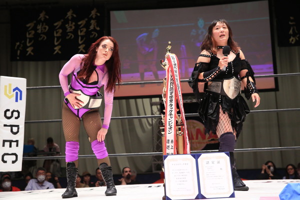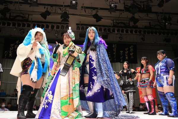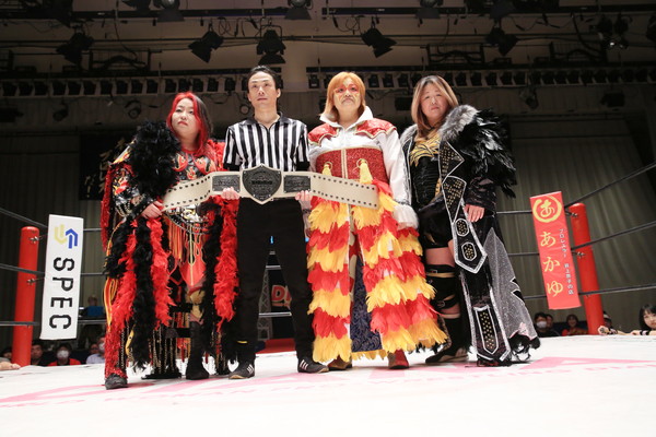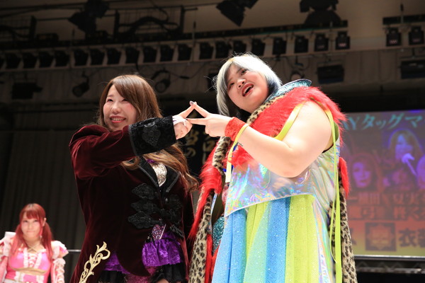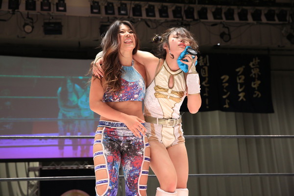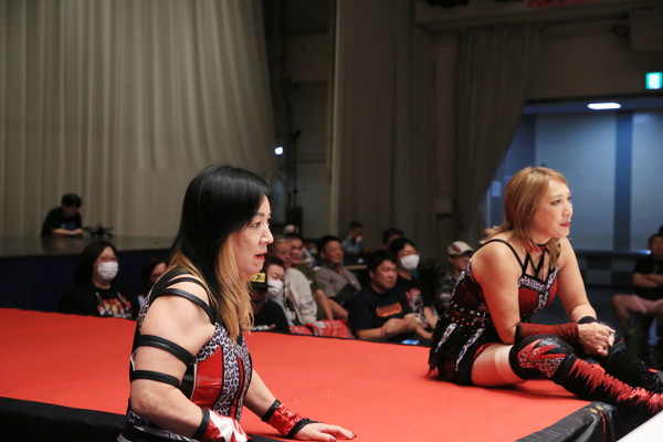 敗れたウナギは「人のためにベルト巻くなんてよくないよね。自分のために頑張らないといけないと思ったし、ちょちょたんと巻きたいって気持ちが足りなかったのかなとも思う。次はお母さんのためにも自分自身のためにも、結果を出したいと思います」とちょぶき再結成の流れを覆し、梅咲も苦笑いだ。梅咲は「南側で自分のお母さんとウナのお母さんが見に来てくれて、応援してくれてた。誰かのために頑張るのも自分のために頑張るのも同じ気持ち。なんでウナギさんと組むの?ってよく聞かれるけどウナのこと好きだし。私たちにはまだまだ力が足りないので、もう一回ちゃんと仕切り直して、ちょぶきでしっかりやっていく」と、母のため、自分のため、そしてウナギのためにも改めてタッグ獲りに向けて歩んでいく。とにもかくにも、現在タッグ王座は空位。これからのタッグ戦線はさらなる嵐が吹き荒れる予感だ。
