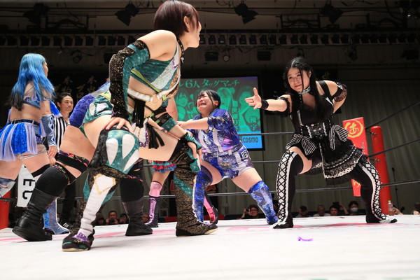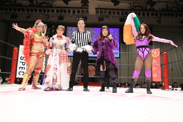世羅命名“引退三銃士”は最も引退が近い本間の入場曲でリングイン。会場に駆け付けたファンは万感の思いで名前を呼ぶ。対する見送り軍は、香藤が試合開始前から早くも大泣き…。「泣くな」「まだ早い」「終わってからにしろ」と全員が総ツッコミだ。香藤の涙でみんなが笑顔になったところで、試合開始のゴング!まずはSPiCEAPの2人が先発。ファンは大・多恵コールで歓迎する。ロックアップからの押し合いで尾﨑が圧倒し、香藤も加わりWタックル。そして美蘭もドロップキック。しかし今回は対戦相手のはずだが、いつもの癖で(?)SPiCEAPの連携が見事に決まってしまう。優宇が「ふざけんな」と割って入り、今度は引退三銃士のトレイン攻撃が尾﨑を襲う。そして優宇と尾﨑のド迫力のマッチアップ。香藤が優宇の足を引いて転ばし、そこに尾﨑がエルボードロップとセントーンを投下。尾﨑からタッチを受けた美蘭は威勢よくドロップキックを放ち、「上げるぞー!」とボディスラムの構え。ところが優宇の鍛え上げた巨体はびくともせず…。優宇が美蘭を場外へ落とすと、日曜日のお昼にぴったりなみたらし団子。体重が47キロしかない美蘭には「もっとごはんを食べろ!」と一言。そして優宇から世羅に替わり、ブルーオーキッド対決に。世羅がリバースカンパーナで揺さぶり、腰を踏み付け、髪を掴んで引っ張る。世羅が美蘭を赤コーナーに連行すると、本間が美蘭の明るい未来のために邪気払い。美蘭は串刺しドロップキックで尾﨑にチェンジ。尾﨑はタックルにラリアット、本間はサブミッションと、互いに持ち味を活かすSPiCEAP。替わって入った香藤と優宇はもちろんタックルで激しい肉弾戦。両者一歩も引かない白熱の攻防に。香藤が優宇を場外に落とすことに成功し、香藤はまさかの「みたらし団子、もらいます!」。大粒の涙をこぼしながら、優宇から継承したというみたらし団子で突撃!リングに戻ると優宇は「ナメんじゃねぇぞ!」と逆水平チョップ。香藤もエルボーで応戦するが、優宇の怪力には敵わず。何とか立ち上がった香藤も怪力を発揮。何と95キロの優宇にボディスラム!観客は拍手喝采!大盛り上がりの中両軍チェンジし、美蘭と世羅のマッチアップ。美蘭がクリストで絞り、エスケープした世羅に追い打ちの619。軽やかな動きの美蘭に対し、世羅はエアーズロックIIで豪快にマットに叩きつける。一番大好きで、一番信頼するパートナーだからこそ勝ちたい美蘭。羅紗鋏を切り返して丸め込み攻勢でひたすらフォールを奪いに行くが世羅が全てキックアウト。美蘭が鮮やかなライオンサルトからフォールすると、カットに飛び込もうとする優宇の影が…。危険を察知した美蘭が回避し、優宇のセントーンが世羅に誤爆。そして香藤めがけて放つ本間のドロップキックの着地点がまさかの世羅。味方からのプレスを浴びまくった世羅は大ピンチに。思わぬ形でチャンスが巡ってきた美蘭は、勢いよく飛びついてウラカン・ラナ!美蘭が全身の力を使って世羅を押さえ、今井レフェリーがマットを3回叩く。世羅からのピンフォールはもちろんこれが初めてだ。美蘭は思わず涙。そして香藤、尾﨑も…。美蘭と世羅、尾﨑と本間、香藤と優宇はそれぞれ抱擁。6人の互いを思う気持ちが1つになり、観客の温かく大きな拍手が包み込んでいた。