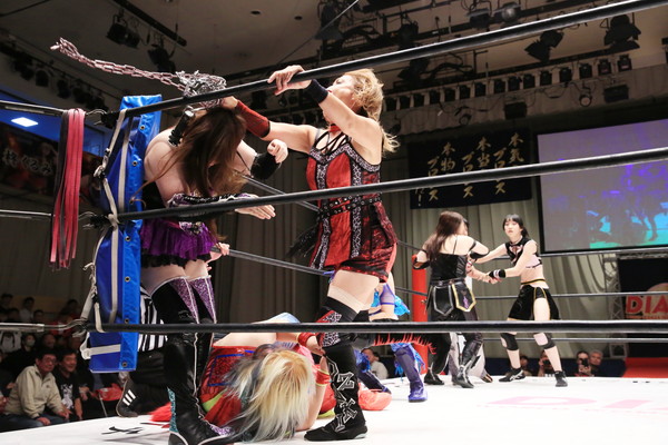 各チームがAGE115に奇襲を仕掛け、ゴングが鳴る。尾崎が早速チェーンを取り出し、凶器攻撃で一掃。このうちにジャガーを捕まえていたのがINVAのHimikoとクームーだ。Wタックル、この日が日本ラストマッチとなるクームーのクロスボディ、Himikoのギロチンを連続でお見舞い。ジャガーが肩を上げるとプロミネンスがAGE115を排除。残る3チームでの戦いに。真琴が夏実を、神姫楽がHimikoを捕らえるが、オリエンタルいのししは誤爆してしまう。そしてINVAが神姫楽と夏実を転がしてWフォール。真琴と柊がそれぞれカットしカウント2に終わり、長身のクームーと力自慢の柊のマッチアップに。クームーのビッグブーツをかわした柊が夏実との息ぴったり連携攻撃。柊がクームーに、夏実がHimikoに同時発射リバーススプラッシュ。続いて真琴に目をつけたプロミネンス。怯えた真琴が「私達、元アイスリボン。一緒にやりましょうよ」と共闘を持ちかけるも全く応じない。プロミネンスの集中砲火を浴びてしまう真琴に神姫楽が助太刀。プロミネンスを場外へ引きずり落とし、リング上からダイビングセントーンを投下!真琴も追撃のWニー。ここまでの3組の戦いを花道でのんびりと観戦…いや、虎視眈々とチャンスをうかがっていたAGE115。リングに1人で戻った神姫楽に、獲物を狙う猛獣のごとく牙をむく…。神姫楽1人に対し重鎮2人が襲いかかると、神姫楽も果敢にジャガーに立ち向かい、真琴も帰還して加勢。INVAもジャガーをターゲットに猛攻だ。神姫楽がジャガーをフォールすると、尾崎がチェーンをレフェリーに向かって投げつけて強引にカット。そしてチェーンで神姫楽をブン殴り、リングから落下させる。後輩たちを場外で一気に捕まえた尾崎。そこにジャガーがダイブして浴びせ蹴り!最もダメージを受けている神姫楽をリングに投げ込むAGE115。合体ブレーンバスター、尾崎の裏拳にオザキック、トドメはジャガーの浴びせ蹴り!猛獣ジャガーが獲物のイノシシを仕留めた。AGE115、大ベテランならではの試合運びで完勝だ。
