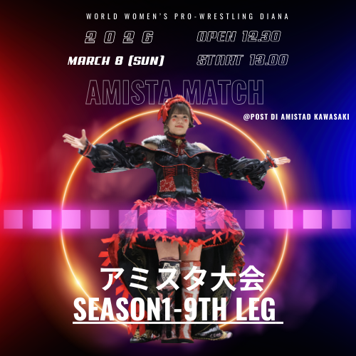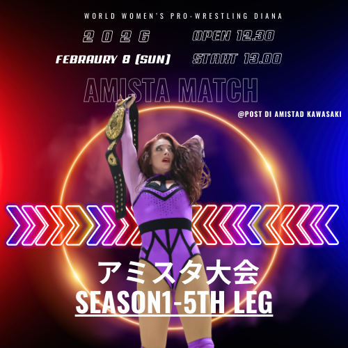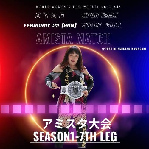 2021年12月30日 に が投稿 発売中チケット 1月28日(水) フューチャーサイトアミスタ大会 Season1-4th leg 開場18:30 開始19:00神奈川県 @ポスト・ディ・アミスタッド川崎 2月23(月・祝) 浜松大会 Season1-8th leg開場12:30 開始13:00@静岡県 発表済みSeason1ラインナップ(予定) 2月8日(日) アミスタ大会 Season1-5th leg 開場12:30 開始13:00神奈川県 @ポスト・ディ・アミスタッド川崎 2月11日(水・祝) フューチャーサイトアミスタ大会 Season1-6th leg 開場17:30 開始18:00神奈川県 @ポスト・ディ・アミスタッド川崎 2月22(日) アミスタ大会 Season1-7th leg 開場12:30 開始13:00神奈川県 @ポスト・ディ・アミスタッド川崎 3月8日(日) アミスタ大会 Season1-9th leg 開場12:30 開始13:00神奈川県 @ポスト・ディ・アミスタッド川崎 3月22日(日) アミスタ大会 Season1-10th leg 開場12:30 開始13:00神奈川県 @ポスト・ディ・アミスタッド川崎 3月25日(水) フューチャーサイト アミスタ大会Season1-11th leg 開場18:30 開始19:00神奈川県 @ポスト・ディ・アミスタッド川崎 3月29日(日) 新木場大会 Season1-12th leg 開場11:30 開始12:00東京 @新木場1st RING 2026年年間試合スケジュール Diana LIVE ディアナの大会をライブストリーミング、アーカイブ視聴ができます。 選手紹介 井上京子 ジャガー横田 佐藤綾子 梅咲遥 羽多乃ナナミ Himiko 美蘭 香藤満月 シャンシャンfrom 新台湾プロレス NENE クームーfrom 新台湾プロレス Anna デビー・カイテル/Debbie Keitelby Diana-Managed Wrestlers Diana公式通販サイト 試合チケットの販売から、所属選手グッズがご購入いただけます。DIANA STORE サイト 「ポスト・ディ・アミスタッド」 スペイン語でPOST(ポスト)=場所、AMISTAD(アミスタッド)=親友を意味する名前をを持つ、常設プロレスリングコートのある施設です。Dianaのホームリングですが、プロレスを通して地域と人の繋がりが生まれる場所としてご活用いただくために、1時間単位からのレンタルができます。本格的なプロレス興行も可能です。POST DI AMISTAD サイト
