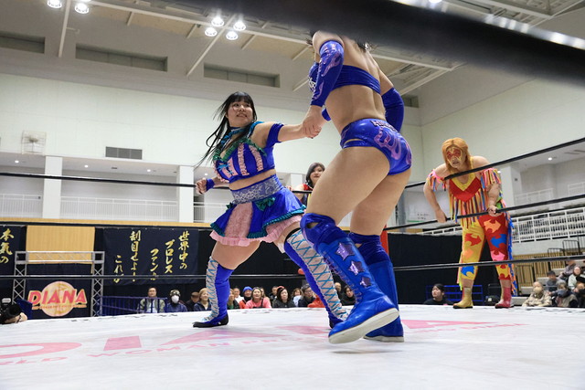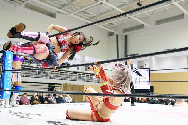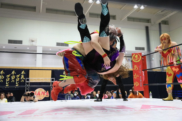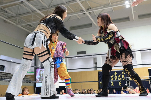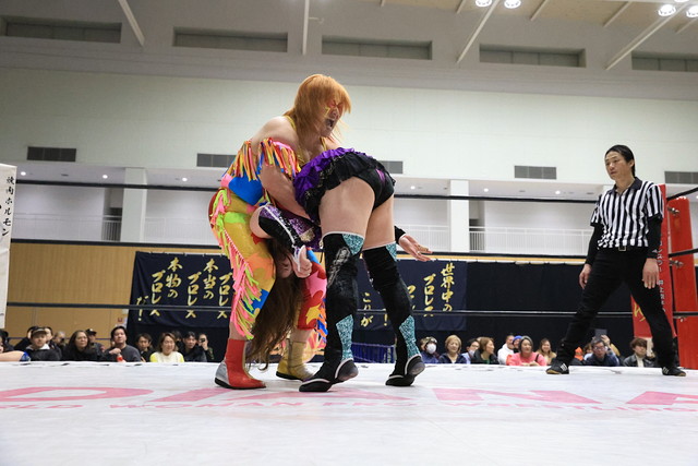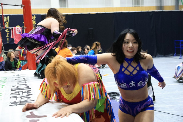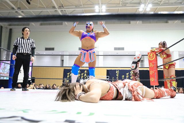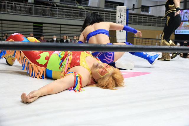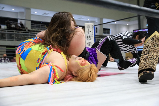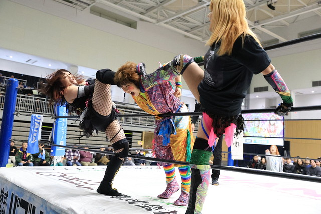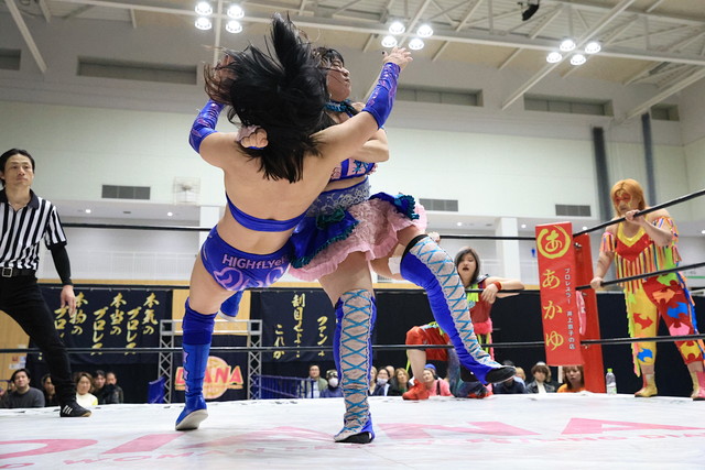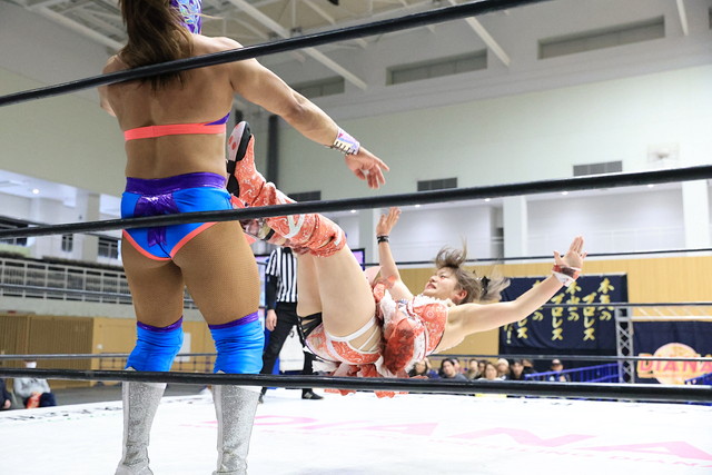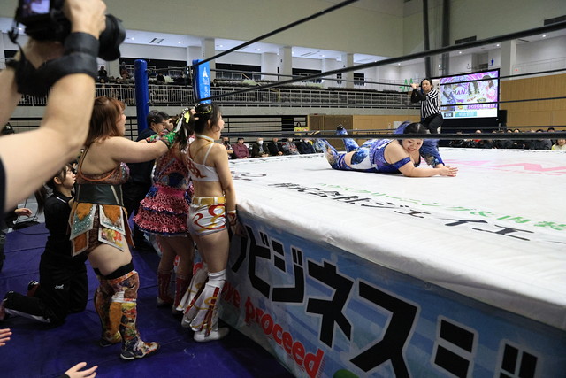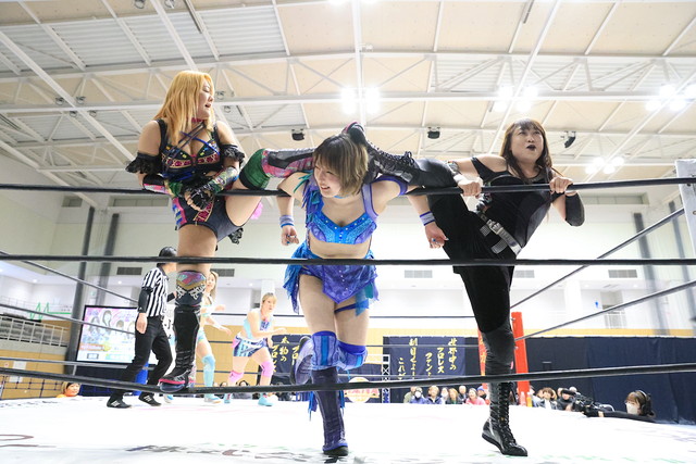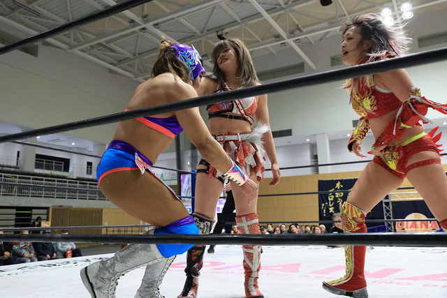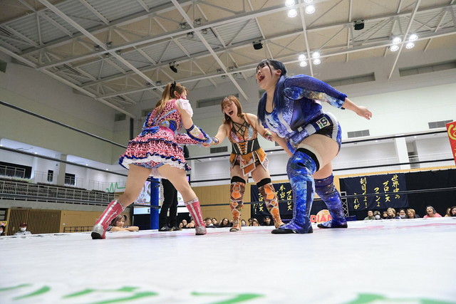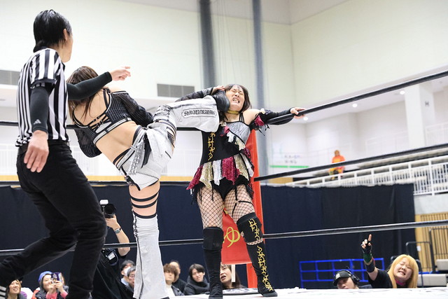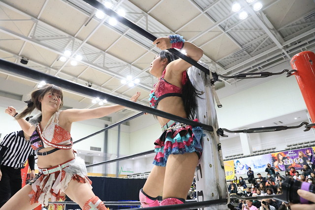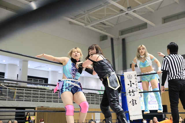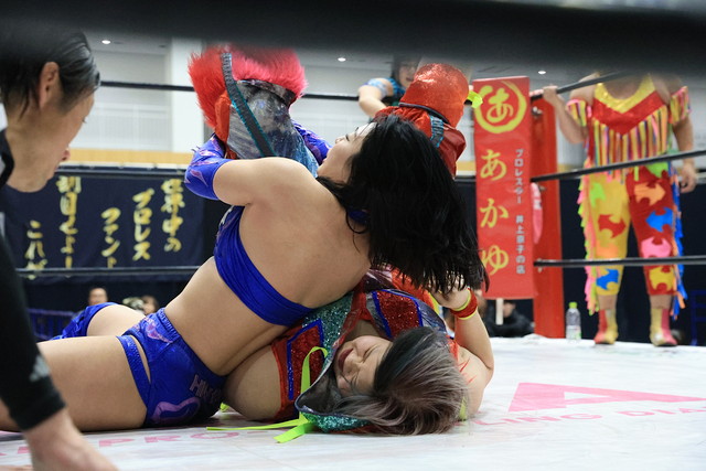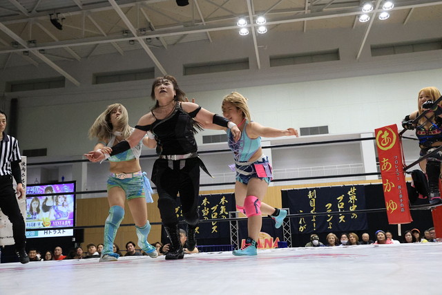 デビーは相変わらずボディチェックを拒否。デビーが逆に玉川勝巳レフェリーにチェックを敢行する。その名の通り柔軟なソフト今井レフェリーとは違い、何としてもチェックしたい真面目な玉川レフェリーが接近すると「No touch!」「ないです」と断固拒否。セコンドの佐藤綾子も「今井さんはいつも大丈夫です」と追い返す。対角のHimikoからは「ちゃんとチェックしろよ」とクレーム…。困った玉川レフェリーだが、目視のみで何とか完了。真面目な浦幌が対戦相手に「お願いします」と握手を求めればデビーは「ノーお願いします」と連れ戻し、レフェリーのみならず味方まで翻弄する。先発はHimikoと浦幌。Himikoが早くも浦幌を捕まえ、ミコマココンビのW攻撃でいたぶる。しっかりチェックを受けたはずのHimikoがTシャツを浦幌の首に巻き付ける反則攻撃に出る。浦幌はタックル連発で真琴に向かっていくが倒せず、ならばとボディスラムの構えも上がらず…。真琴のコブラツイストはロープに逃げた浦幌だが、真琴がロープ蹴りで追い打ち。さらにビッグブーツを顔面に突き刺し、余裕の笑みを浮かべる真琴。浦幌はタックルでようやく真琴を倒し、セントーンで一矢報い、デビーにチェンジ。デビーは挨拶代わりにスピードの乗ったスライディングエルボー。デビーがビッグブーツを放てば、真琴もビッグブーツ。迫力の蹴り合いから真琴がダイナミックなWアームスープレックス。デビーは得意のスライディングラリアットで応戦し、見応えあるマッチアップに。真琴からHimikoにチェンジし、INVA同門対決はデビーがジャンピングニー、ランニングニーと次々ヒザを突き刺してノーザンライトスープレックス。これを返したHimikoは高さのあるバックドロップでデビーをマットに叩きつける。デビーからタッチを受けた浦幌はタックルや連続セントーンでHimikoに立ち向かうが、Himikoが最後の一発をかわして河津掛けからHIGAMIクラッチ。デビーがカットし、浦幌とデビーの連続攻撃。真琴がスピアーで2人まとめてなぎ倒す好アシストを見せるが、浦幌が負けじと丸め込み攻勢。Himikoが自力で返し、「エースクラッシャー!」と叫ぶと、宣言通りエースクラッシャーで浦幌をマットに沈めた。デビーは敗れた浦幌を介抱するかと思いきや暴行!同門のHimikoと握手をかわし、なぜかHimikoもデビーとともに浦幌にストンピング…。INVAの2人は観客の帽子を投げ飛ばしながら引き上げていった。