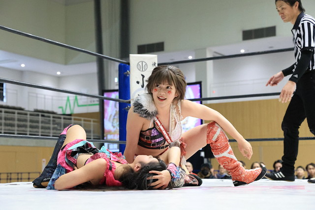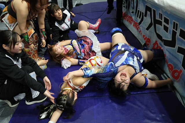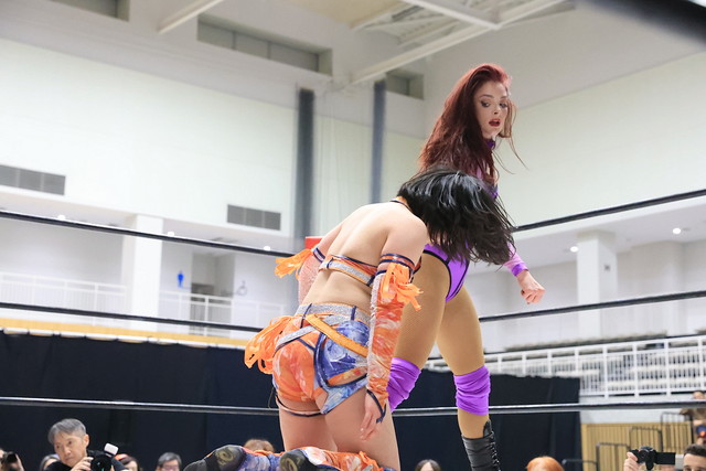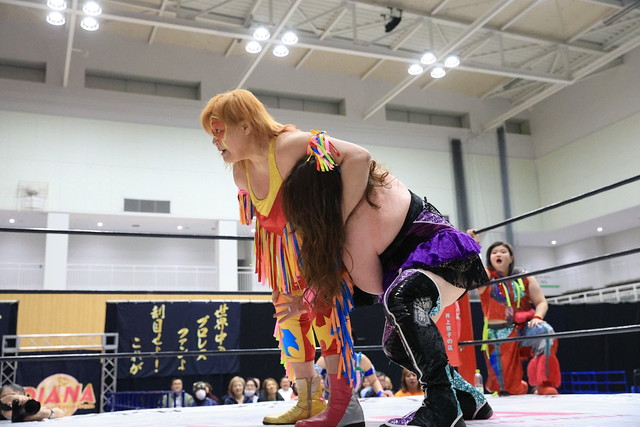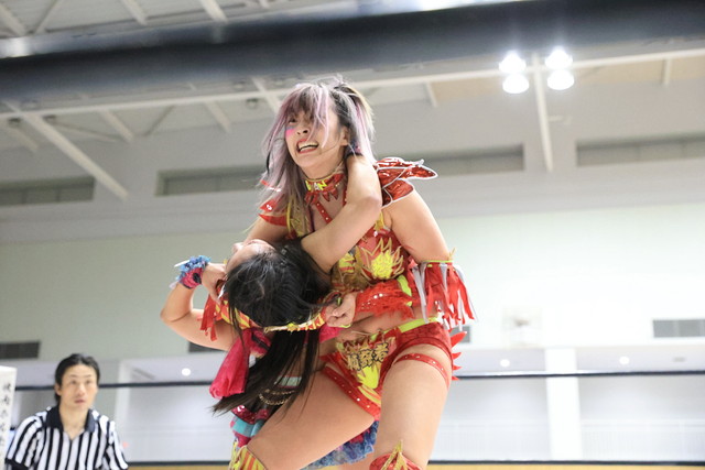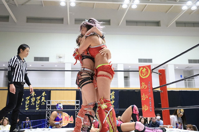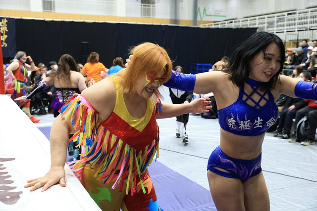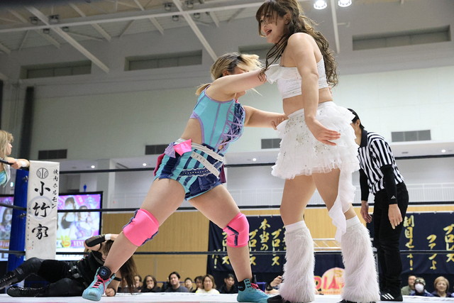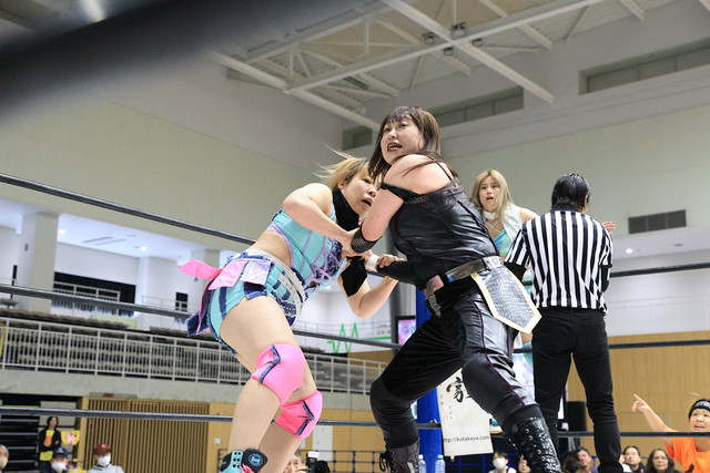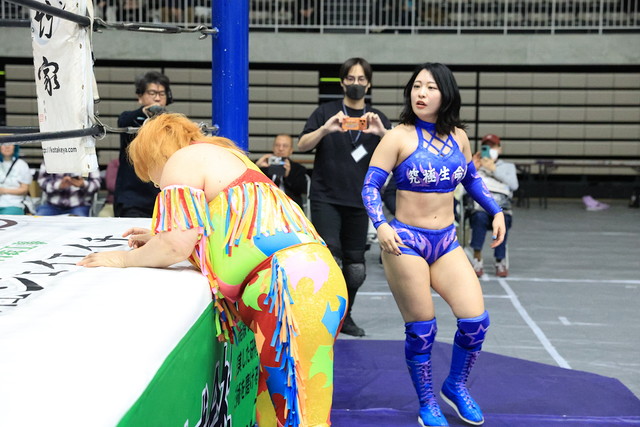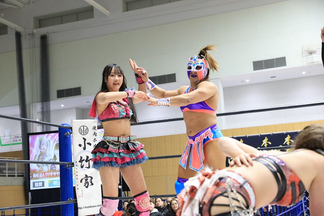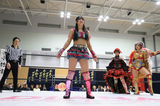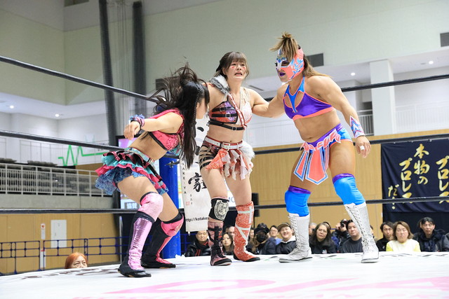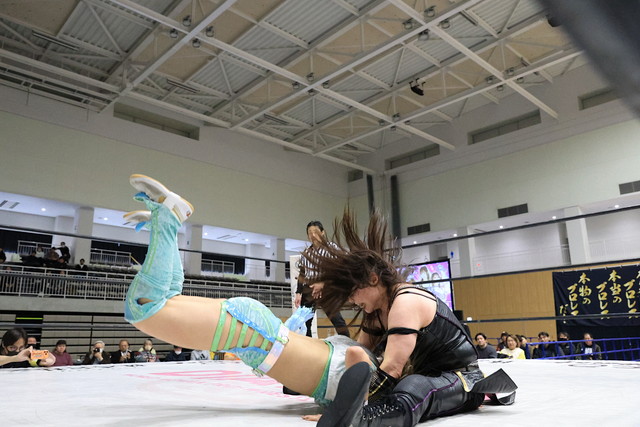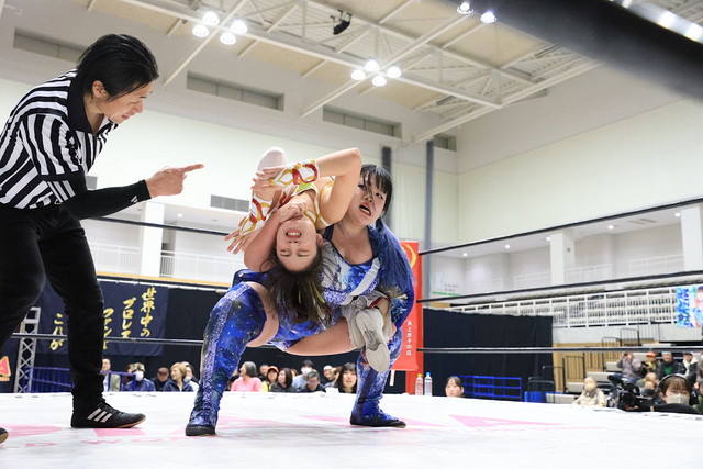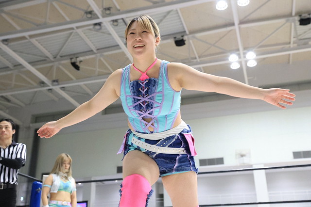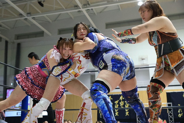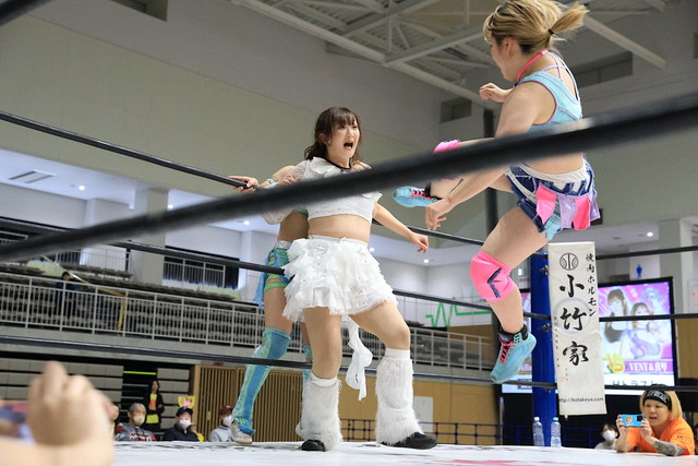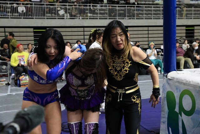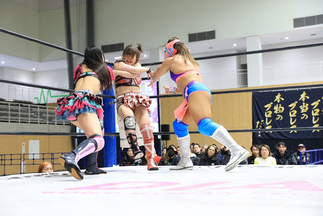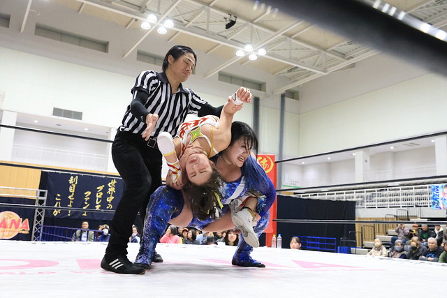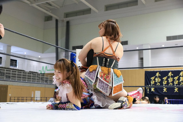 デビーは相変わらずボディチェックを拒否。デビーが逆に玉川勝巳レフェリーにチェックを敢行する。その名の通り柔軟なソフト今井レフェリーとは違い、何としてもチェックしたい真面目な玉川レフェリーが接近すると「No touch!」「ないです」と断固拒否。セコンドの佐藤綾子も「今井さんはいつも大丈夫です」と追い返す。対角のHimikoからは「ちゃんとチェックしろよ」とクレーム…。困った玉川レフェリーだが、目視のみで何とか完了。真面目な浦幌が対戦相手に「お願いします」と握手を求めればデビーは「ノーお願いします」と連れ戻し、レフェリーのみならず味方まで翻弄する。先発はHimikoと浦幌。Himikoが早くも浦幌を捕まえ、ミコマココンビのW攻撃でいたぶる。しっかりチェックを受けたはずのHimikoがTシャツを浦幌の首に巻き付ける反則攻撃に出る。浦幌はタックル連発で真琴に向かっていくが倒せず、ならばとボディスラムの構えも上がらず…。真琴のコブラツイストはロープに逃げた浦幌だが、真琴がロープ蹴りで追い打ち。さらにビッグブーツを顔面に突き刺し、余裕の笑みを浮かべる真琴。浦幌はタックルでようやく真琴を倒し、セントーンで一矢報い、デビーにチェンジ。デビーは挨拶代わりにスピードの乗ったスライディングエルボー。デビーがビッグブーツを放てば、真琴もビッグブーツ。迫力の蹴り合いから真琴がダイナミックなWアームスープレックス。デビーは得意のスライディングラリアットで応戦し、見応えあるマッチアップに。真琴からHimikoにチェンジし、INVA同門対決はデビーがジャンピングニー、ランニングニーと次々ヒザを突き刺してノーザンライトスープレックス。これを返したHimikoは高さのあるバックドロップでデビーをマットに叩きつける。デビーからタッチを受けた浦幌はタックルや連続セントーンでHimikoに立ち向かうが、Himikoが最後の一発をかわして河津掛けからHIGAMIクラッチ。デビーがカットし、浦幌とデビーの連続攻撃。真琴がスピアーで2人まとめてなぎ倒す好アシストを見せるが、浦幌が負けじと丸め込み攻勢。Himikoが自力で返し、「エースクラッシャー!」と叫ぶと、宣言通りエースクラッシャーで浦幌をマットに沈めた。デビーは敗れた浦幌を介抱するかと思いきや暴行!同門のHimikoと握手をかわし、なぜかHimikoもデビーとともに浦幌にストンピング…。INVAの2人は観客の帽子を投げ飛ばしながら引き上げていった。