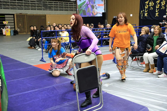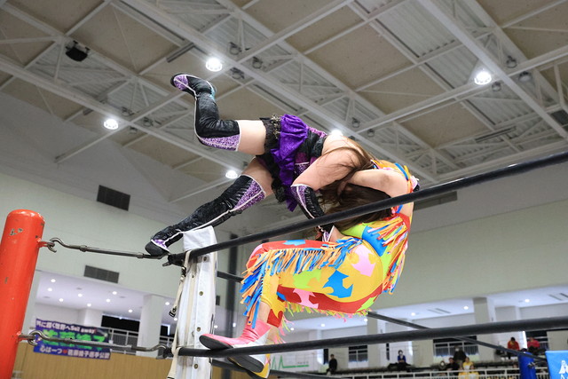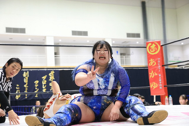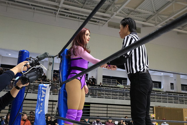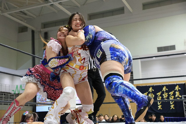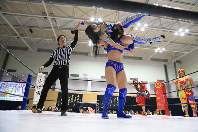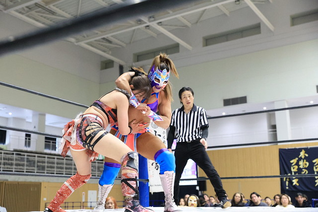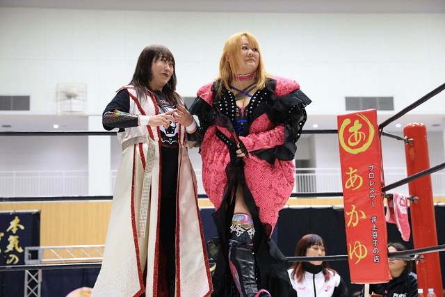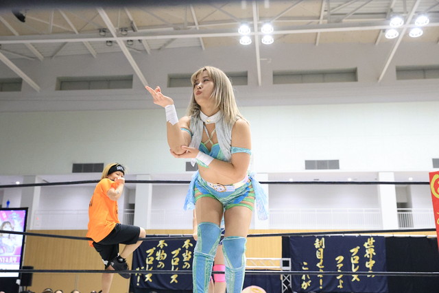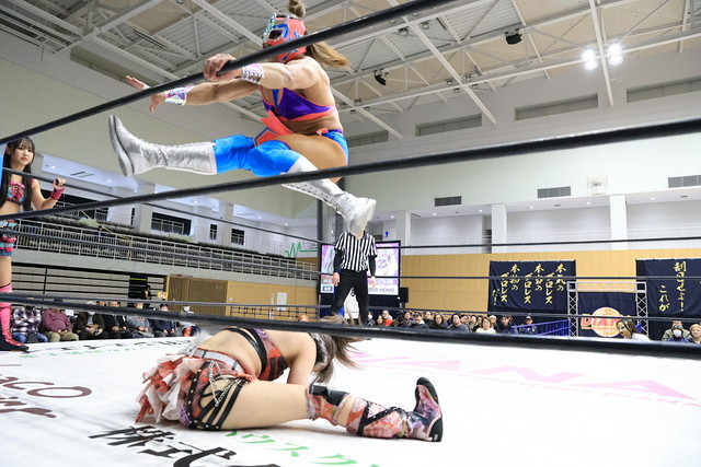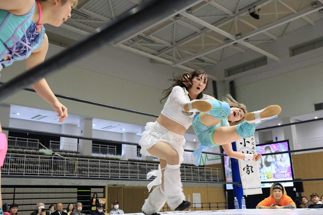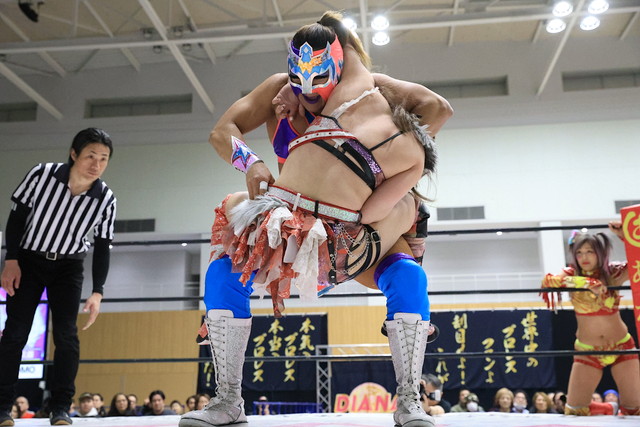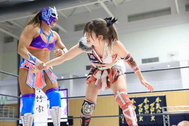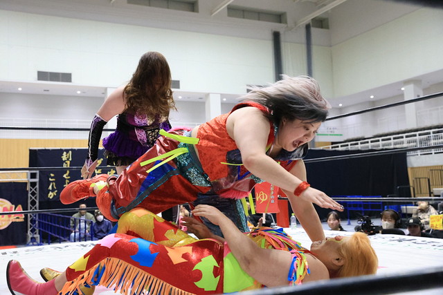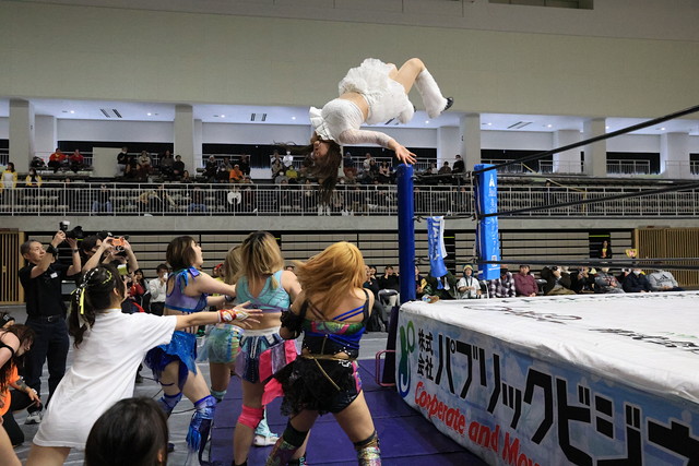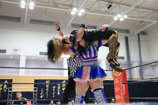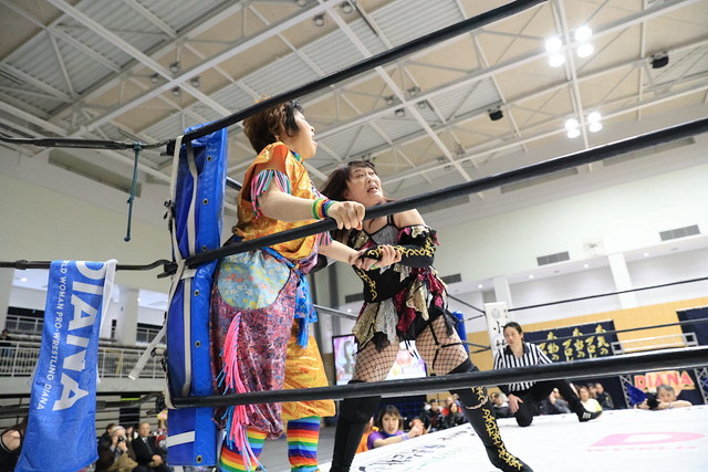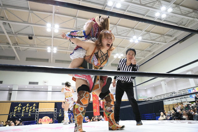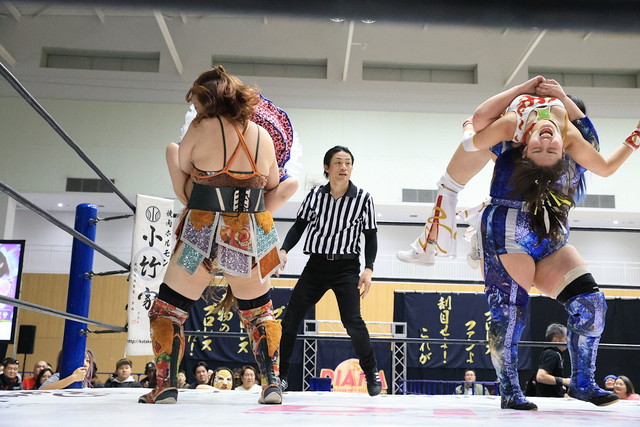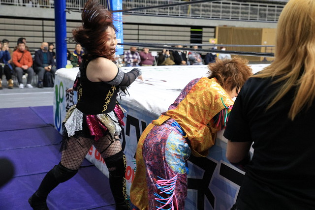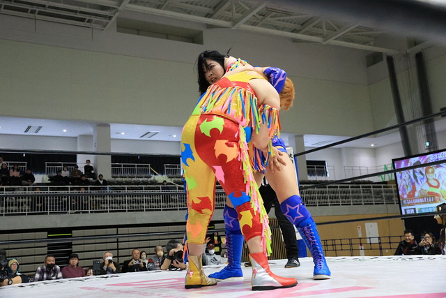 デビーは相変わらずボディチェックを拒否。デビーが逆に玉川勝巳レフェリーにチェックを敢行する。その名の通り柔軟なソフト今井レフェリーとは違い、何としてもチェックしたい真面目な玉川レフェリーが接近すると「No touch!」「ないです」と断固拒否。セコンドの佐藤綾子も「今井さんはいつも大丈夫です」と追い返す。対角のHimikoからは「ちゃんとチェックしろよ」とクレーム…。困った玉川レフェリーだが、目視のみで何とか完了。真面目な浦幌が対戦相手に「お願いします」と握手を求めればデビーは「ノーお願いします」と連れ戻し、レフェリーのみならず味方まで翻弄する。先発はHimikoと浦幌。Himikoが早くも浦幌を捕まえ、ミコマココンビのW攻撃でいたぶる。しっかりチェックを受けたはずのHimikoがTシャツを浦幌の首に巻き付ける反則攻撃に出る。浦幌はタックル連発で真琴に向かっていくが倒せず、ならばとボディスラムの構えも上がらず…。真琴のコブラツイストはロープに逃げた浦幌だが、真琴がロープ蹴りで追い打ち。さらにビッグブーツを顔面に突き刺し、余裕の笑みを浮かべる真琴。浦幌はタックルでようやく真琴を倒し、セントーンで一矢報い、デビーにチェンジ。デビーは挨拶代わりにスピードの乗ったスライディングエルボー。デビーがビッグブーツを放てば、真琴もビッグブーツ。迫力の蹴り合いから真琴がダイナミックなWアームスープレックス。デビーは得意のスライディングラリアットで応戦し、見応えあるマッチアップに。真琴からHimikoにチェンジし、INVA同門対決はデビーがジャンピングニー、ランニングニーと次々ヒザを突き刺してノーザンライトスープレックス。これを返したHimikoは高さのあるバックドロップでデビーをマットに叩きつける。デビーからタッチを受けた浦幌はタックルや連続セントーンでHimikoに立ち向かうが、Himikoが最後の一発をかわして河津掛けからHIGAMIクラッチ。デビーがカットし、浦幌とデビーの連続攻撃。真琴がスピアーで2人まとめてなぎ倒す好アシストを見せるが、浦幌が負けじと丸め込み攻勢。Himikoが自力で返し、「エースクラッシャー!」と叫ぶと、宣言通りエースクラッシャーで浦幌をマットに沈めた。デビーは敗れた浦幌を介抱するかと思いきや暴行!同門のHimikoと握手をかわし、なぜかHimikoもデビーとともに浦幌にストンピング…。INVAの2人は観客の帽子を投げ飛ばしながら引き上げていった。