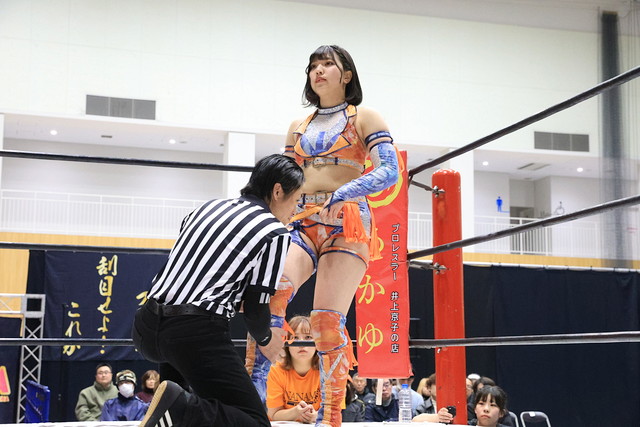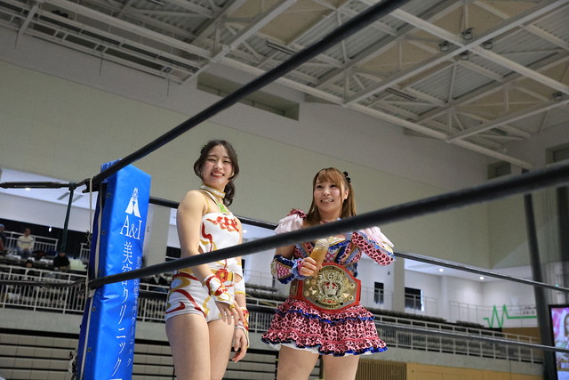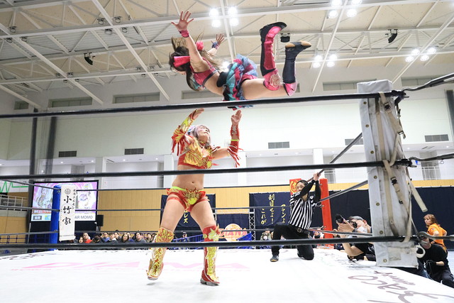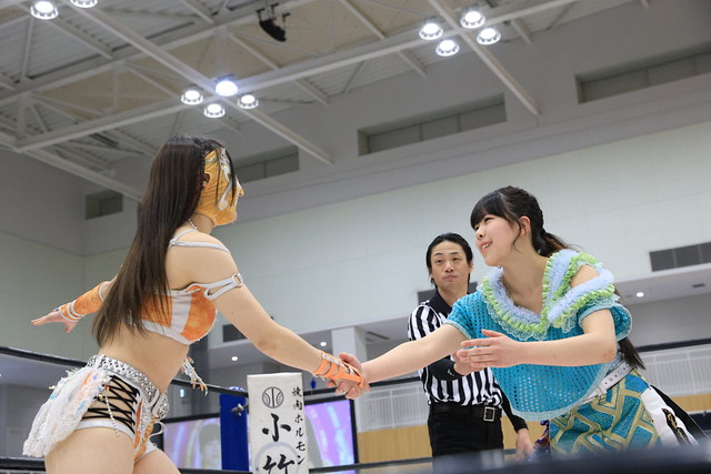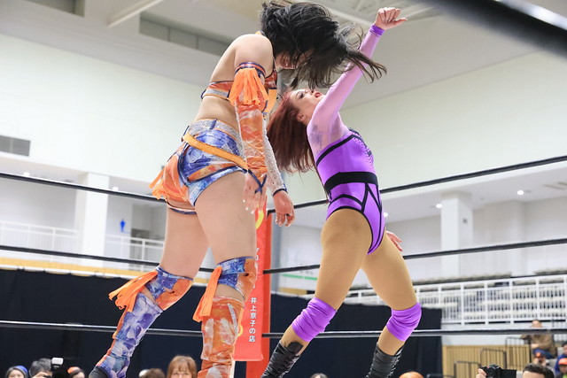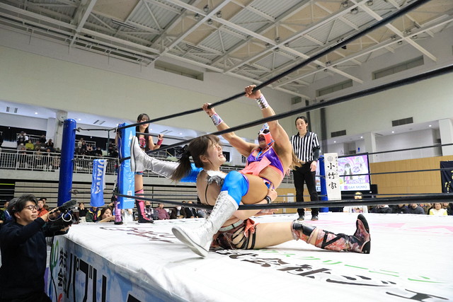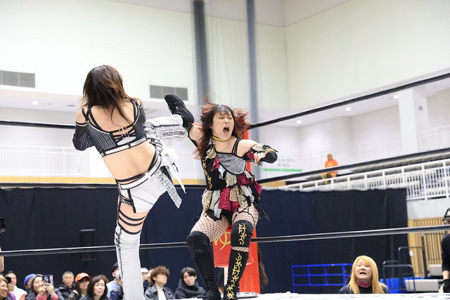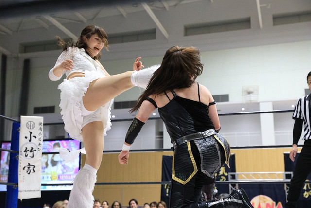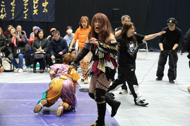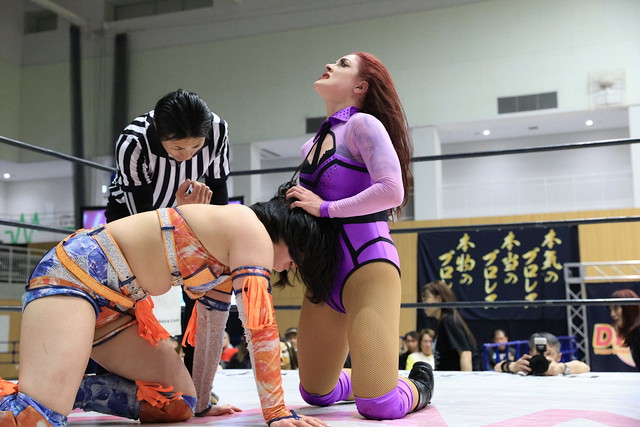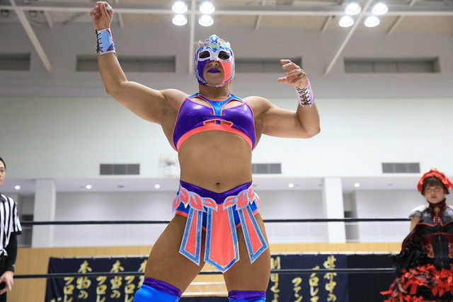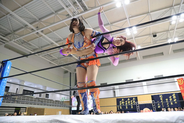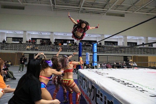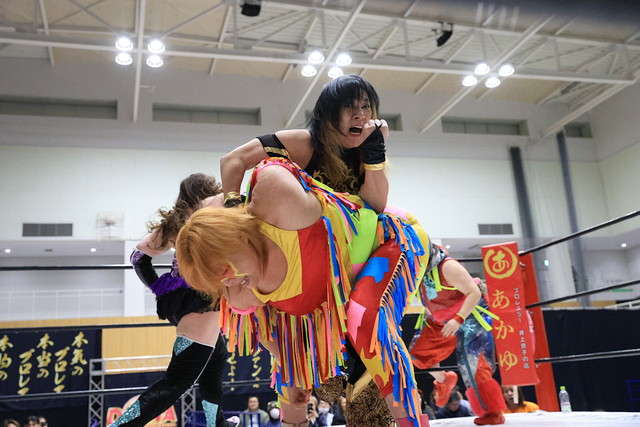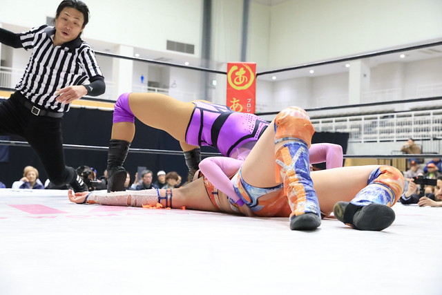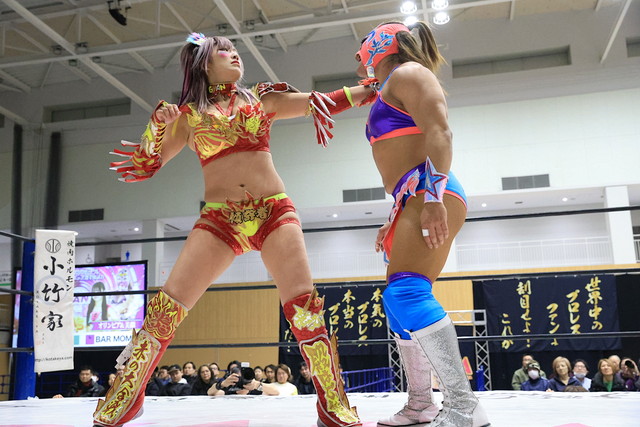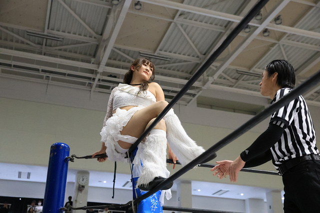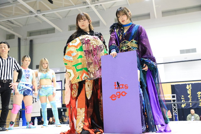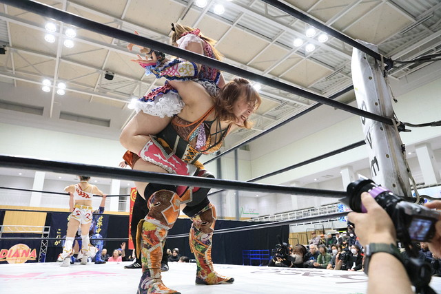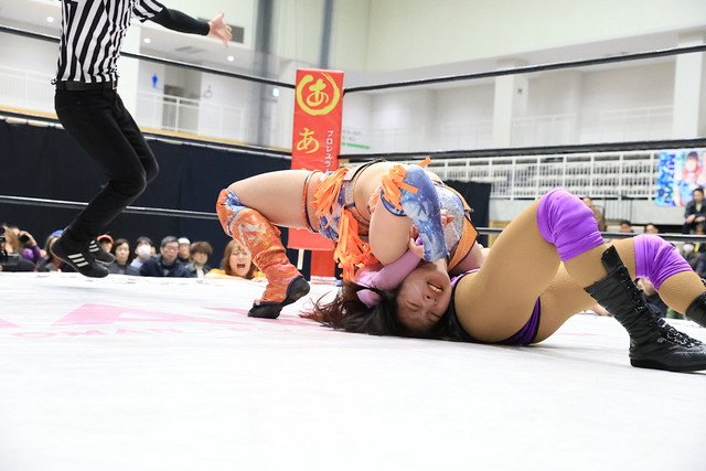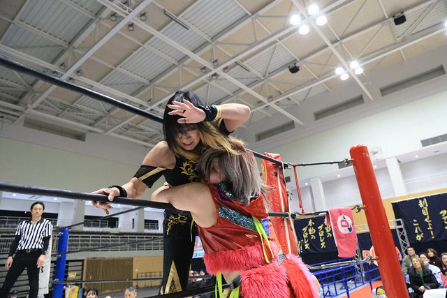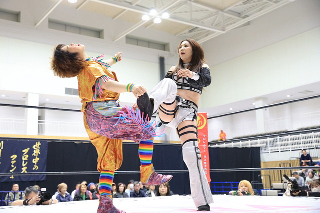デビーは相変わらずボディチェックを拒否。デビーが逆に玉川勝巳レフェリーにチェックを敢行する。その名の通り柔軟なソフト今井レフェリーとは違い、何としてもチェックしたい真面目な玉川レフェリーが接近すると「No touch!」「ないです」と断固拒否。セコンドの佐藤綾子も「今井さんはいつも大丈夫です」と追い返す。対角のHimikoからは「ちゃんとチェックしろよ」とクレーム…。困った玉川レフェリーだが、目視のみで何とか完了。真面目な浦幌が対戦相手に「お願いします」と握手を求めればデビーは「ノーお願いします」と連れ戻し、レフェリーのみならず味方まで翻弄する。先発はHimikoと浦幌。Himikoが早くも浦幌を捕まえ、ミコマココンビのW攻撃でいたぶる。しっかりチェックを受けたはずのHimikoがTシャツを浦幌の首に巻き付ける反則攻撃に出る。浦幌はタックル連発で真琴に向かっていくが倒せず、ならばとボディスラムの構えも上がらず…。真琴のコブラツイストはロープに逃げた浦幌だが、真琴がロープ蹴りで追い打ち。さらにビッグブーツを顔面に突き刺し、余裕の笑みを浮かべる真琴。浦幌はタックルでようやく真琴を倒し、セントーンで一矢報い、デビーにチェンジ。デビーは挨拶代わりにスピードの乗ったスライディングエルボー。デビーがビッグブーツを放てば、真琴もビッグブーツ。迫力の蹴り合いから真琴がダイナミックなWアームスープレックス。デビーは得意のスライディングラリアットで応戦し、見応えあるマッチアップに。真琴からHimikoにチェンジし、INVA同門対決はデビーがジャンピングニー、ランニングニーと次々ヒザを突き刺してノーザンライトスープレックス。これを返したHimikoは高さのあるバックドロップでデビーをマットに叩きつける。デビーからタッチを受けた浦幌はタックルや連続セントーンでHimikoに立ち向かうが、Himikoが最後の一発をかわして河津掛けからHIGAMIクラッチ。デビーがカットし、浦幌とデビーの連続攻撃。真琴がスピアーで2人まとめてなぎ倒す好アシストを見せるが、浦幌が負けじと丸め込み攻勢。Himikoが自力で返し、「エースクラッシャー!」と叫ぶと、宣言通りエースクラッシャーで浦幌をマットに沈めた。デビーは敗れた浦幌を介抱するかと思いきや暴行!同門のHimikoと握手をかわし、なぜかHimikoもデビーとともに浦幌にストンピング…。INVAの2人は観客の帽子を投げ飛ばしながら引き上げていった。