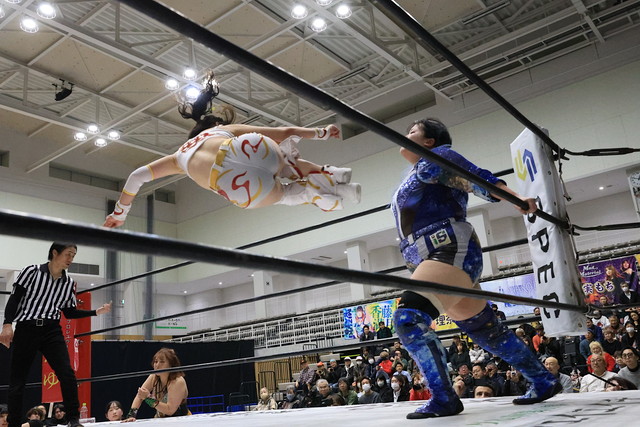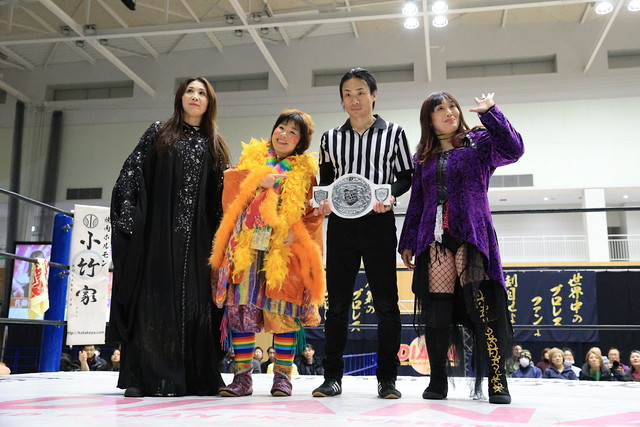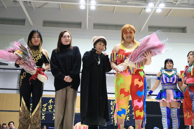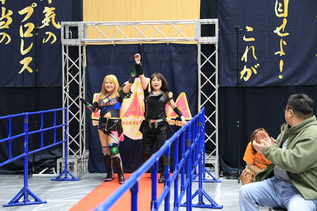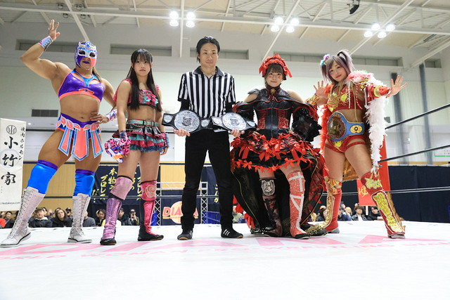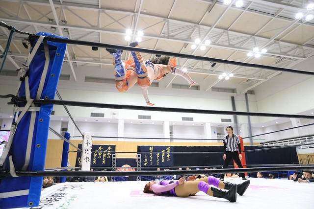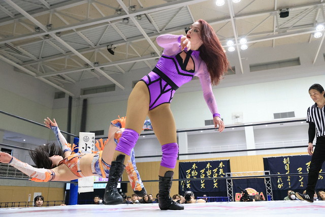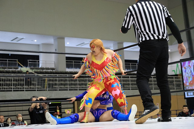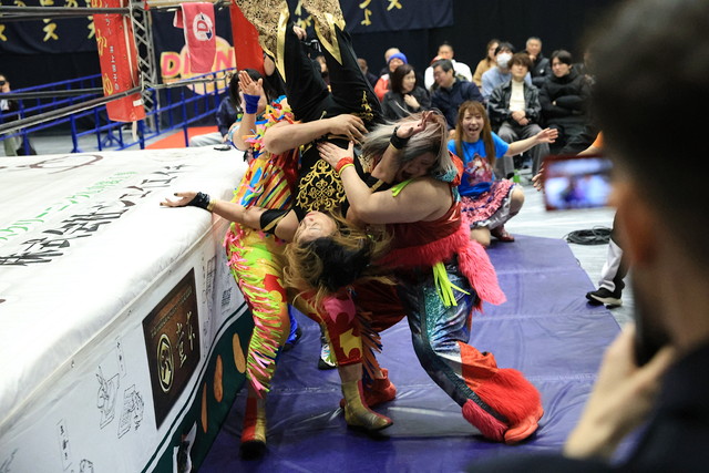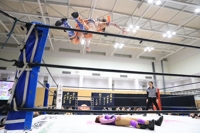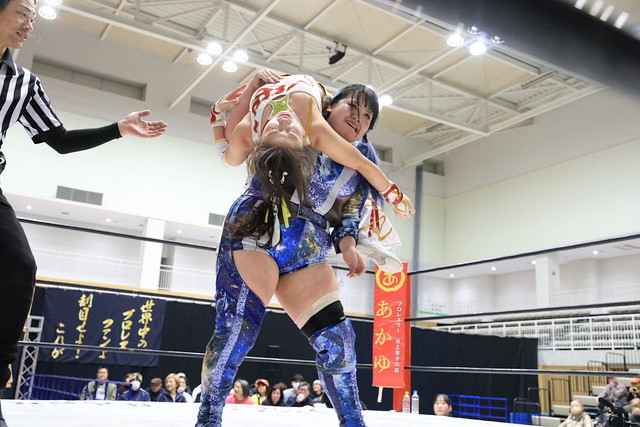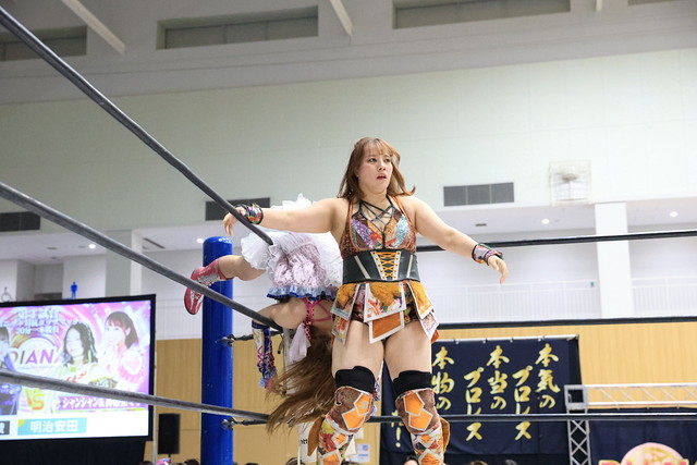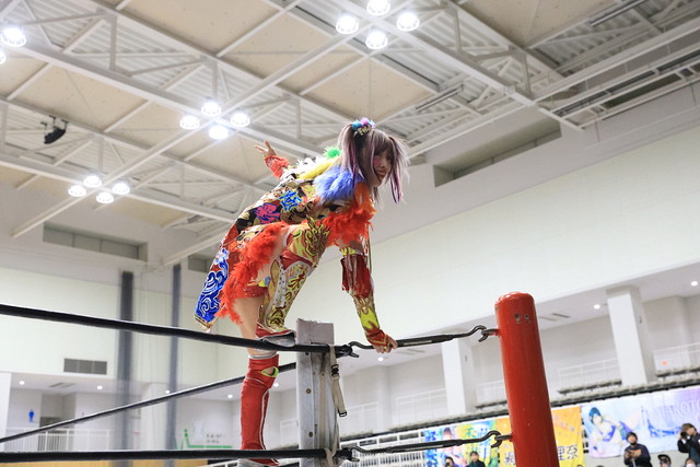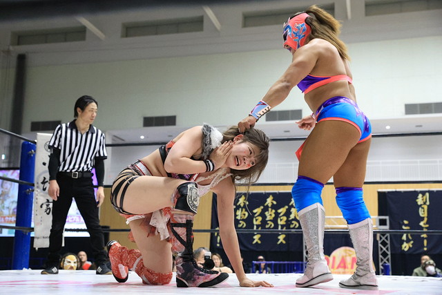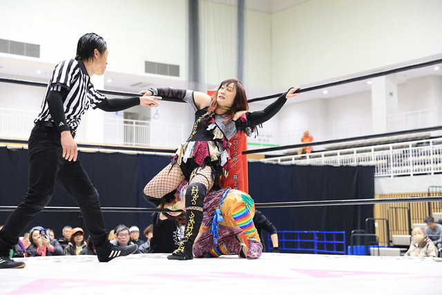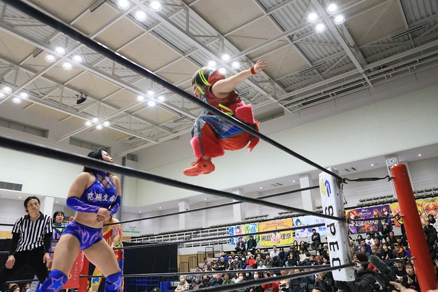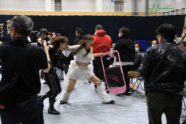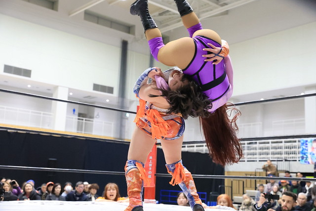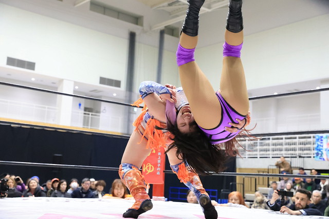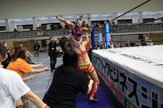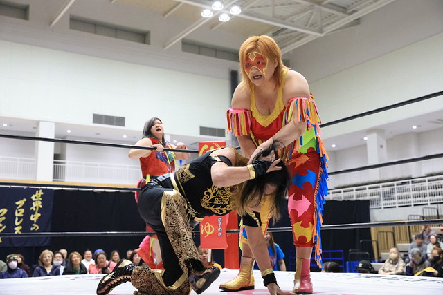 デビーは相変わらずボディチェックを拒否。デビーが逆に玉川勝巳レフェリーにチェックを敢行する。その名の通り柔軟なソフト今井レフェリーとは違い、何としてもチェックしたい真面目な玉川レフェリーが接近すると「No touch!」「ないです」と断固拒否。セコンドの佐藤綾子も「今井さんはいつも大丈夫です」と追い返す。対角のHimikoからは「ちゃんとチェックしろよ」とクレーム…。困った玉川レフェリーだが、目視のみで何とか完了。真面目な浦幌が対戦相手に「お願いします」と握手を求めればデビーは「ノーお願いします」と連れ戻し、レフェリーのみならず味方まで翻弄する。先発はHimikoと浦幌。Himikoが早くも浦幌を捕まえ、ミコマココンビのW攻撃でいたぶる。しっかりチェックを受けたはずのHimikoがTシャツを浦幌の首に巻き付ける反則攻撃に出る。浦幌はタックル連発で真琴に向かっていくが倒せず、ならばとボディスラムの構えも上がらず…。真琴のコブラツイストはロープに逃げた浦幌だが、真琴がロープ蹴りで追い打ち。さらにビッグブーツを顔面に突き刺し、余裕の笑みを浮かべる真琴。浦幌はタックルでようやく真琴を倒し、セントーンで一矢報い、デビーにチェンジ。デビーは挨拶代わりにスピードの乗ったスライディングエルボー。デビーがビッグブーツを放てば、真琴もビッグブーツ。迫力の蹴り合いから真琴がダイナミックなWアームスープレックス。デビーは得意のスライディングラリアットで応戦し、見応えあるマッチアップに。真琴からHimikoにチェンジし、INVA同門対決はデビーがジャンピングニー、ランニングニーと次々ヒザを突き刺してノーザンライトスープレックス。これを返したHimikoは高さのあるバックドロップでデビーをマットに叩きつける。デビーからタッチを受けた浦幌はタックルや連続セントーンでHimikoに立ち向かうが、Himikoが最後の一発をかわして河津掛けからHIGAMIクラッチ。デビーがカットし、浦幌とデビーの連続攻撃。真琴がスピアーで2人まとめてなぎ倒す好アシストを見せるが、浦幌が負けじと丸め込み攻勢。Himikoが自力で返し、「エースクラッシャー!」と叫ぶと、宣言通りエースクラッシャーで浦幌をマットに沈めた。デビーは敗れた浦幌を介抱するかと思いきや暴行!同門のHimikoと握手をかわし、なぜかHimikoもデビーとともに浦幌にストンピング…。INVAの2人は観客の帽子を投げ飛ばしながら引き上げていった。