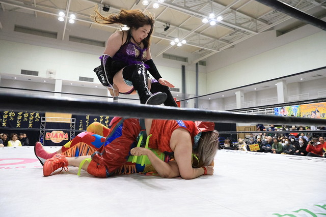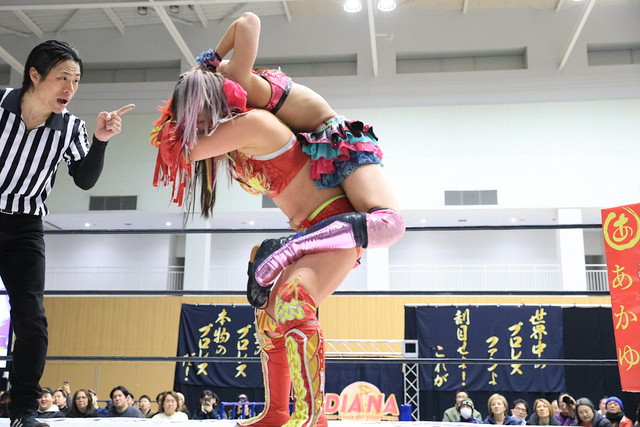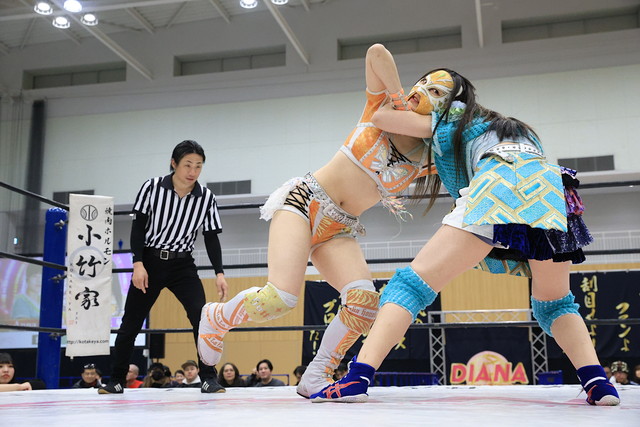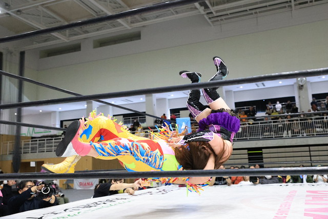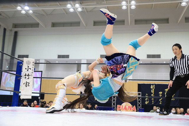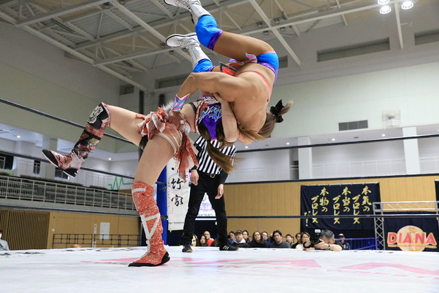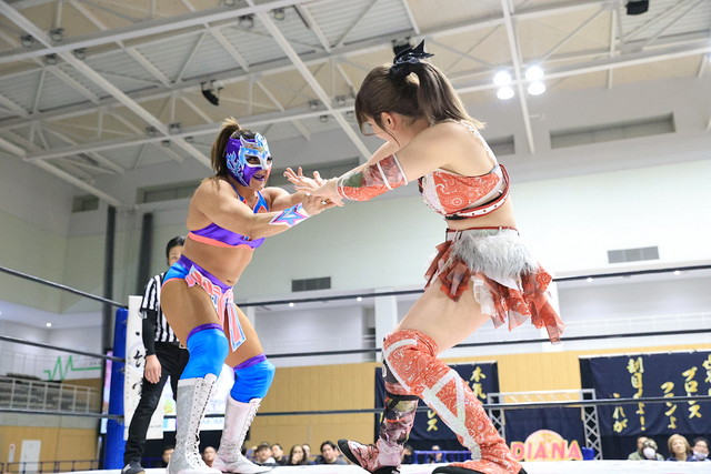 前回の参戦でインパクトを残したエチカが2回目のディアナ登場。まずロックアップからの押し合いでナナミを一気にロープまで押す。ナナミがタックルで突撃するも、何度ぶつかっても持ちこたえるエチカ。カウンターのビッグブーツ一発でナナミを蹴散らしてみせる。ならばとナナミはエルボーで勝負。ナナミも力強いエルボーを打っていくが、エチカも強烈な一撃を放つ。ナナミは膝蹴りでエチカの動きを止め、長い手足を活かした変形コブラツイストで捕獲。そのままグラウンドで絞り上げるが、エチカがロープに足を伸ばす。ナナミは間髪入れずに追撃だ。串刺しボディアタックにタックルでぶつかっていくが、それでもエチカは倒れない。エチカは破壊力抜群の串刺しビッグブーツでナナミの顔面を撃ち抜く。ナナミはリング中央でのスリーパーで絞め落としにかかるが、エチカがしぶとく堪えてエスケープ。さらにナナミのタックルをキックで迎撃する。ナナミはもう一度変則ロープワークから渾身のタックルでようやくエチカを倒し、ダイビングボディプレス投下。ナナミが流れを掴んだかに見えたが、エチカがSTOでフォール。返したナナミはエチカのサンセットフリップをかわし、フィッシャーマンズスープレックスホールド。カウント2で返したエチカはチョップで凄まじい音を鳴らし、ブレーンバスターから押さえ込む。ナナミが肩を上げてもしつこく押さえ込み、ナナミもしぶとく肩を上げる。エチカのチョークスラムはナナミがスクールボーイに切り返し、続くセブンスリーホールドで勝利をもぎ取った。
