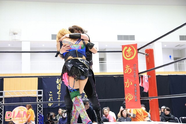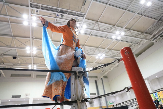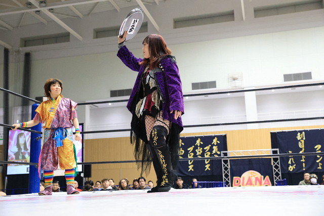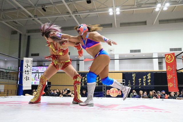 毎年恒例の梅咲コスチュームマッチは、出場予定だったシャンシャンが負傷のため欠場。W.W.W.Dクリスタル王座とトライアングルリボンの二冠を保持する美蘭がシャンシャンのために一肌脱ぎ、なんと1対2のハンディキャップマッチに変更!その美蘭はディアナ入門前は梅咲ファン。着てみたかったというお気に入りの赤と黒のチェック柄で梅咲になりきる。対角の松下は梅咲の最新コスチュームを、Annaはじゃじゃ馬制覇時のスポーティーな一着を選び、それぞれ自身のイメージカラーのリボンで髪を結った。セコンドとして参加のシャンシャンも赤と青のド派手なデザインをかわいらしく着こなす。そして高r…いや恒例の、皆さんお待ちかね!松澤さん登場!大会前は「今年は何もしません」と話していた松澤さんだが、いざ試合が始まればすっかり「未来から来た遥」を自称し、ピンクのコスチュームにリボンまでつけてノリノリだ。ただし、この日は真琴のマネージャーとして来場していたので、入場時コールは無し…。「何でコールしねぇんだよ!」とリングアナウンサーにクレームをつけ、「40年後の遥だよ」と笑顔でアイドルポーズ。入場で一番盛り上げた松澤さんだが、松下に退場を促されお役御免。