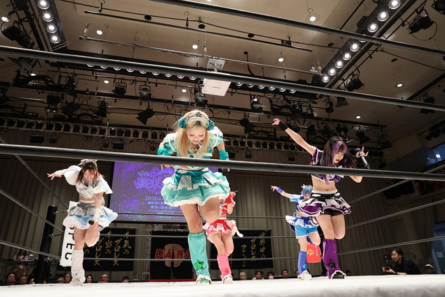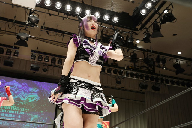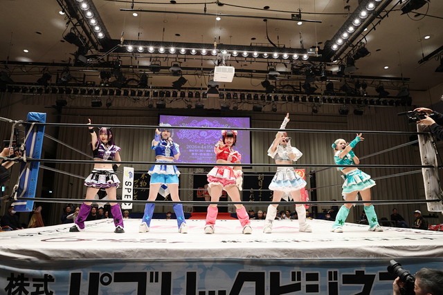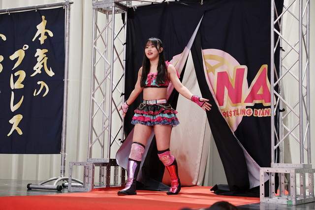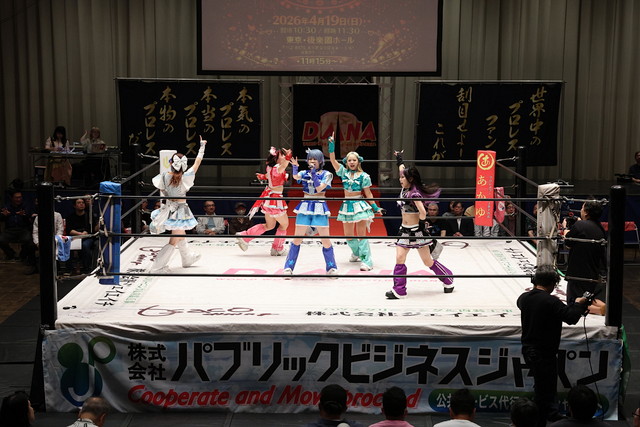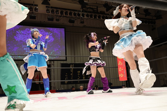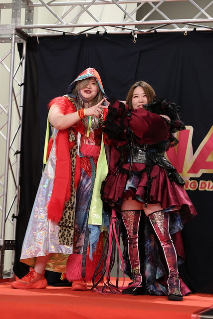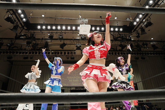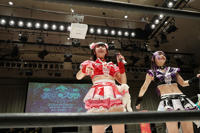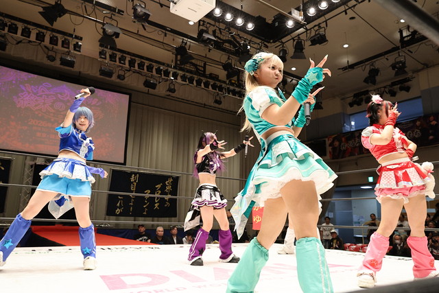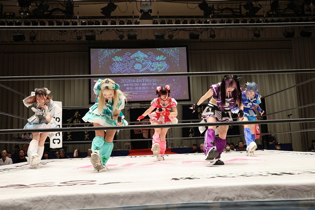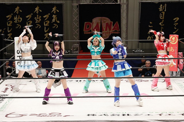試合開始前にはオープニングアクトとしてアイドルグループ・終末のステラが初登場。観客席ではペンライトが揺れ、個性豊かなメンバーによる激しいダンスでリングが揺れる。約15分間、ノンストップで3曲を熱唱し、大会を盛り上げた。ライブ後はプロレス観戦も楽しんでいたようだ。ディアナは15周年、終末ステは5周年。初にしてメモリアルなコラボとなった。