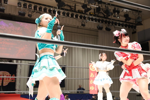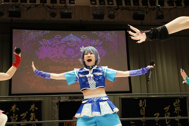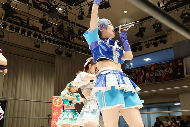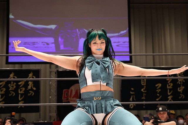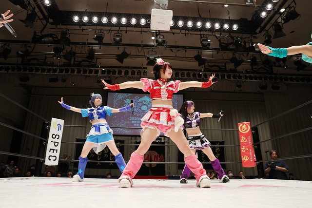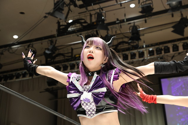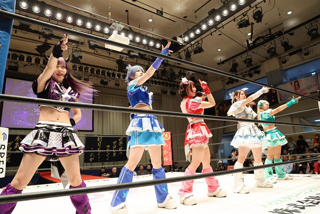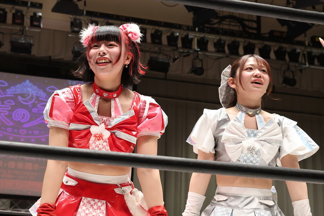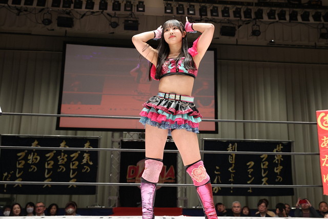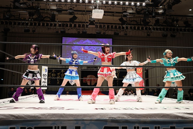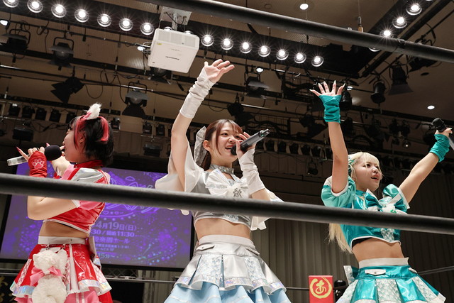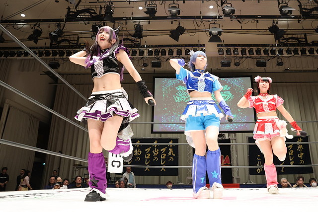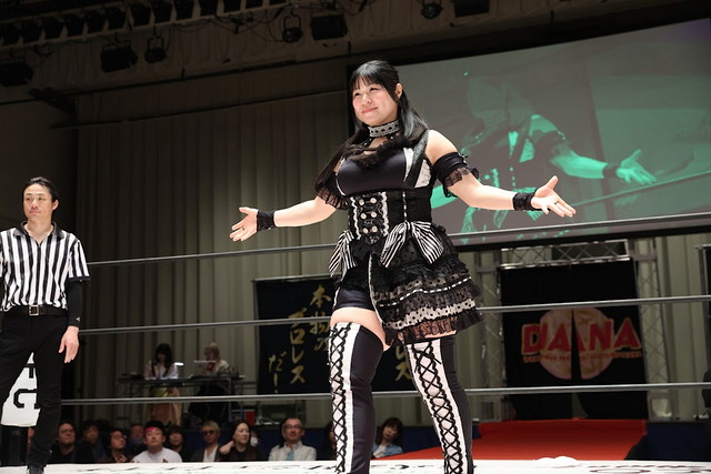 試合開始前にはオープニングアクトとしてアイドルグループ・終末のステラが初登場。観客席ではペンライトが揺れ、個性豊かなメンバーによる激しいダンスでリングが揺れる。約15分間、ノンストップで3曲を熱唱し、大会を盛り上げた。ライブ後はプロレス観戦も楽しんでいたようだ。ディアナは15周年、終末ステは5周年。初にしてメモリアルなコラボとなった。