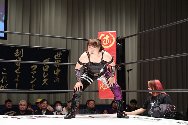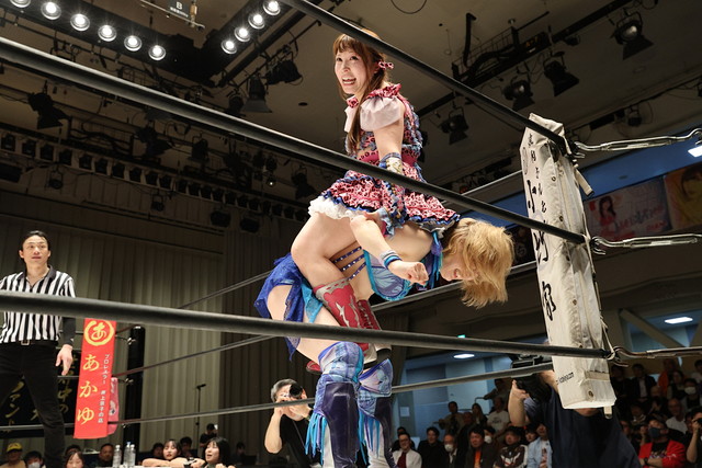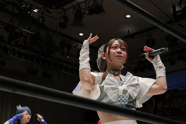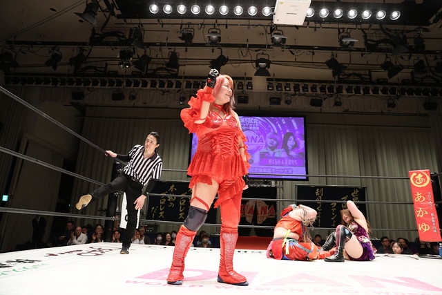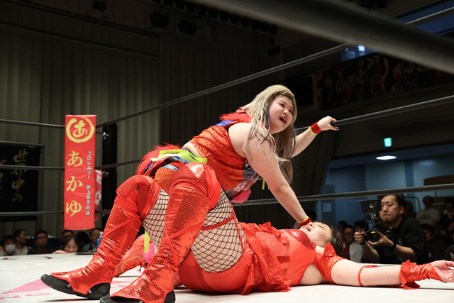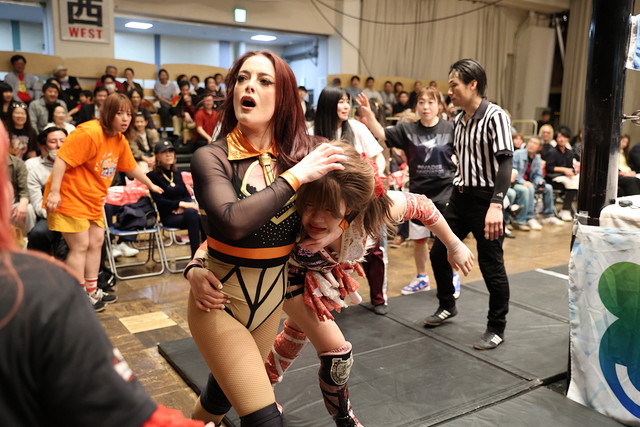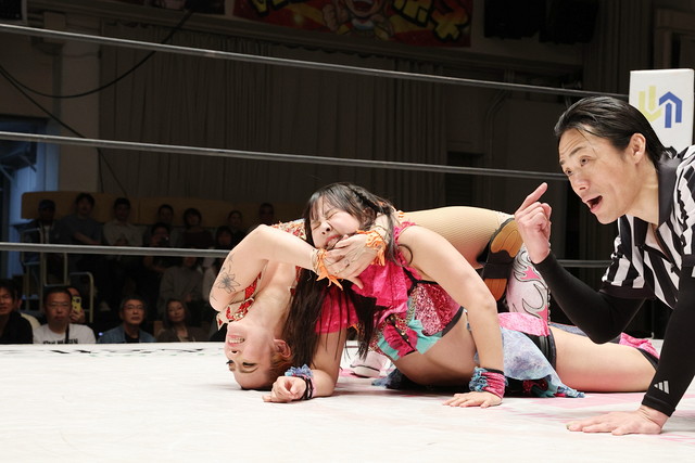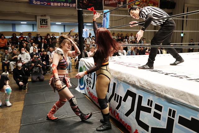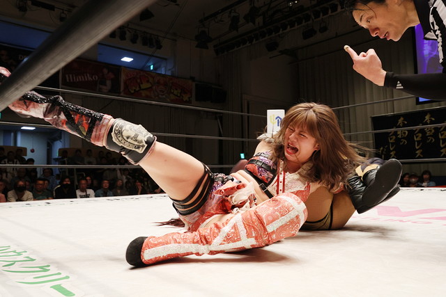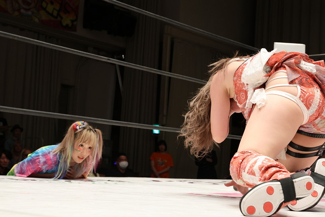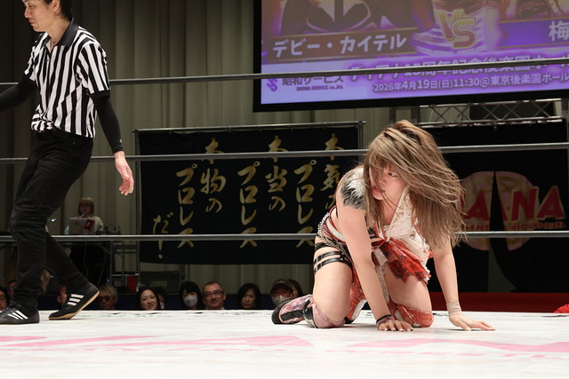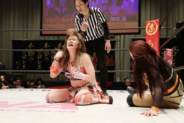 Annaが握手と見せかけて奇襲をしかけるも、やはり梅咲がドロップキックで逆襲し圧倒。荒ぶる梅咲が反則を繰り返し、観客はその度に大ブーイング。それでもお構いなしに反則を交えて新人をいたぶる絶対センター、どんどん大きくなるブーイング…。セコンドからも「大人げないぞ」と怒りの声。Annaをロープにはりつけ髪を掴む反則三昧からドロップキックを突き刺してフォールを主張するが、今井レフェリーは「反則だろ!」とノーフォール。「いつも(カウント)取ってるのに」と不満顔の梅咲。反則なしの逆エビ固めはAnnaの手がロープに届いてエスケープ。やられっぱなしではいられないAnnaも梅咲をロープにはりつけてエルボー乱れ打ち。もちろんこれも反則なのだがAnna贔屓の今井レフェリーは「行け!」とAnnaを後押し。そしてAnnaが逆さ押さえ込みでフォールすると今井レフェリーが1.25倍速(?)カウント。ギリギリで返した梅咲だが「速いだろ!」とブチギレ!その隙にAnnaがドロップキック!ここからAnnaはクロスボディ、馬乗りエルボーと間髪入れず攻めまくっていく。反撃されても立ち上がり、そしていよいよ梅咲相手にエルボー勝負に出る!気迫でエルボーを打ちまくるAnna。これでスイッチが入った梅咲は渾身のエルボー一撃でAnnaを吹っ飛ばし「Annaの心配ばっかりして、ふざけんなよ」と今井レフェリーへの怒りを滲ませる。立ち上がったAnnaは丸め込み攻勢で大金星を狙い、スクールボーイを連発。何とか肩を上げ続ける梅咲だが、セコンドのナナミと網倉、そしてAnnaはスリーを主張。「スリー!」の声が飛ぶが、とにかく逃げ切った梅咲は急角度逆エビ固めでぐいぐい絞るがAnnaが根性でエスケープ。ロープにやっと辿り着いたAnnaに、梅咲は勢い良すぎる低空ドロップキックをお見舞い。これには梅咲サイドのセコンド陣からも「やりすぎ」…。先輩の厳しい攻撃もキックアウトしたAnna。手応えを感じた様子の梅咲はトドメのミサイルキックで勝負を決めた。勝ったものの、不公平なレフェリーに首を傾げていた…。
