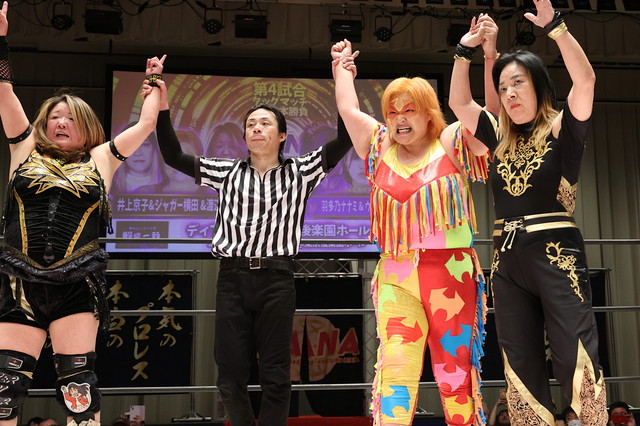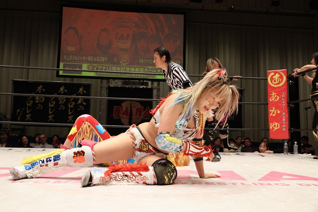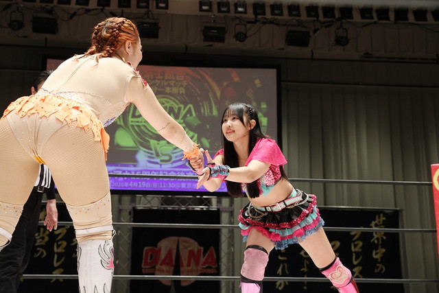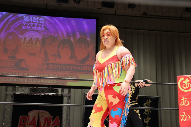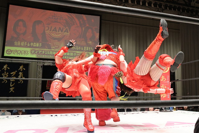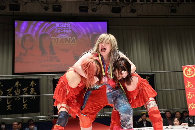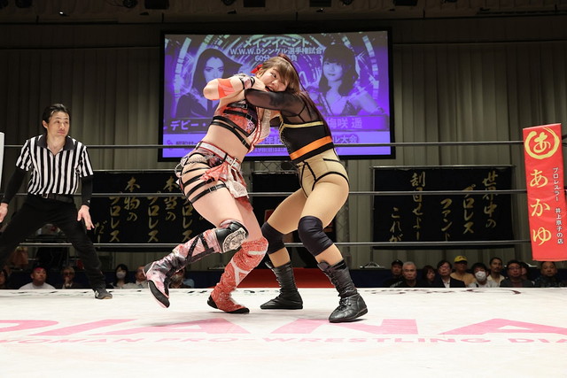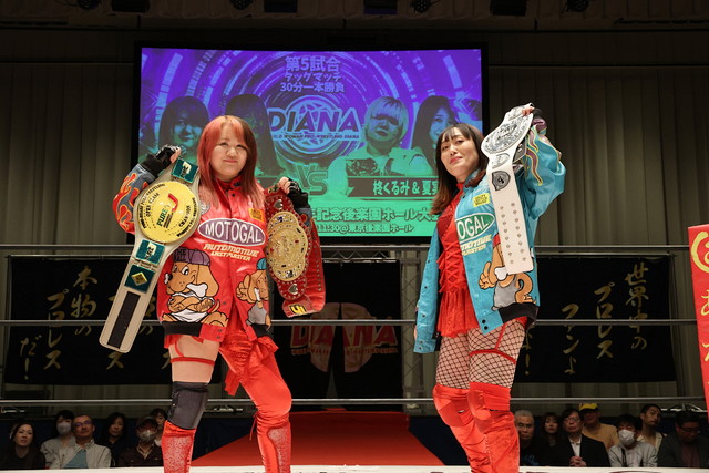 シングル王者とタッグ王者が激突!ディアナの黄金カードともいえる、見どころ盛りだくさんのタッグマッチがメインを飾る。 それぞれユニットリーダーとして、INVAの暴走に対抗する梅咲とナナミによる“えーがた”が久々復活。デビーへのリベンジに燃えるナナミ、W.W.W.Dシングル・タッグの二冠を目指す梅咲。それぞれのファイトに注目だ。 この日は帽子を被ったお客様が多く、ご機嫌に帽子を飛ばしまくりながら登場するシングル王者のデビー。憧れの存在・井上京子とのタッグで更なる大暴れを予感させる。 まずはデビーと梅咲の王者対決。デビーがいきなりの反則で先制攻撃。ハイスピードな攻防で会場を沸かせ、見栄を切って両軍チェンジ。普段はTradition and Inheritedとして行動を共にする京子とナナミがマッチアップ。ディアナ社長でレジェンドレスラーの京子に、ディアナ生え抜き若手ホープのナナミが挑む図式だが、ナナミがロックアップから111キロの巨体をロープにぐいぐい押し込んでいく。続いてタックルで果敢に突撃するが、これは京子が受け止める。何度跳ね返されても何度でもぶつかっていくナナミ。京子も負けじと力強いエルボーを打ち、タックルでナナミを倒す。ナナミはすぐさま立ち上がり、フェイスロックで京子を捕獲。腕を極めながら青コーナーに連行し、梅咲にチェンジする。威勢よく飛び出した梅咲だったが、京子のへアホイップで豪快に投げ飛ばされてしまい、大きなお尻の餌食に。おまけにデビーのお尻まで食らってしまう。梅咲もボディスラムから執念深い押さえ込みでフォールするなど反撃し、ナナミにチェンジ。デビーの足攻めやレフェリーの目を盗む反則攻撃に苦しむナナミ。対するデビーは優位を保って京子にチェンジし、ナナミも梅咲にチェンジするが、京子は鋭い視線で梅咲に圧!観客からは「遥!ビビるな!」の声も…。ビビりながらも、いざリング上で対峙すれば燃える梅咲。「怖くねーよ!」とエルボー速射砲を撃ちまくる。対して京子は数より一発の重みで勝負!一撃のエルボーで梅咲をダウンさせる。アシストに入るデビーに誤爆を誘った梅咲は、場外へ落下したデビーと京子めがけてプランチャ発射!リングに戻ればミサイルキック2連発に梅スプラッシュと飛びまくる。それでも高い京子の壁…京子は立ち上がり、梅咲をジャーマンでぶん投げる。さらに剛腕唸るラリアットで追撃。ナイアガラ発射準備はナナミが阻止するが、京子はラリアットで2人まとめてなぎ倒す。梅咲のピンチにナナミも奮起。タックルでついに京子を倒すと間髪入れずにダイビングボディプレス投下。コーナー上から京子を捕まえスリーパーで絞め落としにかかり、反則カウント4で解除すると今度はリング中央で胴締めスリーパー。京子が危うく落ちかけたところでデビーのカットが間に合う。ならばとナナミは京子をダイナミックな裏投げでマットに叩きつけてフォール。京子の肩がカウント2で上がると、今度はバックを取ってジャーマンの構え…だがこれは上がらず、京子がロープを掴んでエスケープ。ラリアットで形勢逆転し、デビーにタッチする。デビーは串刺しビッグブーツ、ナナミはタックルと両者得意の打撃で勝負。ナナミのノーザンライトスープレックスを持ちこたえたデビーがカウンターでノーザンライトスープレックスをお返し。ナナミもすぐさま立ち上がり今度こそのノーザンライト。鮮やかなブリッジでフォールするがこれでも決着つかず…Wダウン状態から先に動き出したのはナナミだ。試合時間は残り3分、一度は返上したものの再びシングル王座獲りに燃える梅咲に試合を託した。ダメージの残るデビーにキューティースペシャル、エルボーの乱れ撃ちで向かっていく梅咲。続く串刺し攻撃は京子の「すかせ!」の声が届き、デビーが寸前で回避。そこに見透かしたかのように京子がラリアット!さらにデビーがジャンピングニー、スライディングエルボーと打撃の嵐に。それでもしぶとい絶対センター。カウント2で自力で返し、梅スプラッシュ。シングル王者もしぶとく自力キックアウトだ。残り僅かな時間の中で力を出し尽くす両者。高さのあるエスプレッソで梅咲の顔が苦痛に歪む…梅咲の大ピンチはナナミが飛び込みカットが間に合う。残り10秒、梅咲が渾身のジャーマンスープレックスで弧を描くが体勢がやや崩れノーフォール。クラッチを解除しフォールに行くが、押さえ込む前に時間切れを告げるゴングが鳴る。これが決まっていればあるいは…とも思わせる幕切れとなった。まだまだやり足りない梅咲とデビーは髪を掴んで睨み合い、両軍無言でリングを後にした。