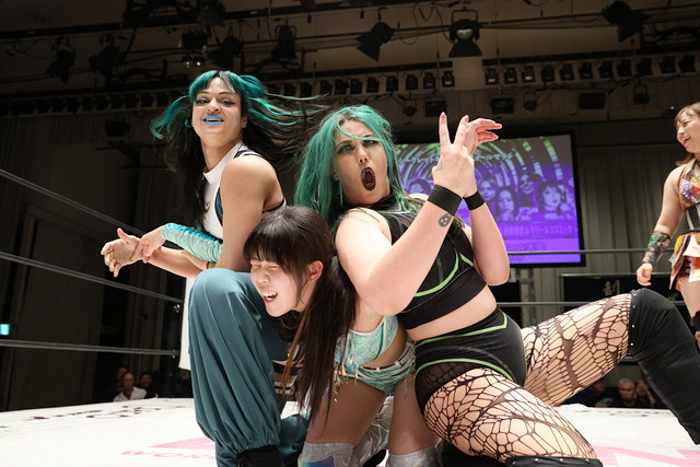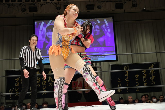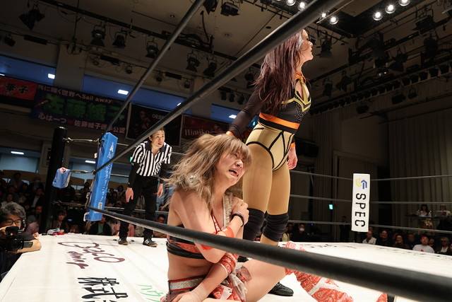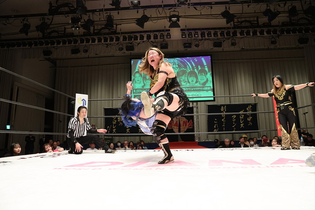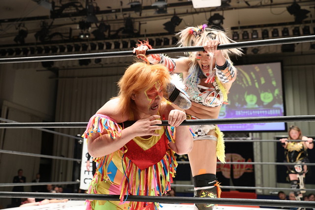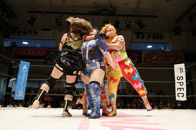 まずはデビーと美蘭がそれぞれ先発。だがデビーが美蘭をあっさり追い出し「Come on!」とコーナーで控える梅咲を挑発。梅咲がリングに入ると、デビーは早速佐藤との合体攻撃。佐藤をドロップキックで蹴散らした美蘭が梅咲に代わってデビーに向かっていき、スピードのあるヘッドシザーズホイップでデビーを投げ飛ばす。デビーから佐藤に代わると、ベテランvs若手の図式に。やはり佐藤が抜群のテクニックで美蘭を追い込んでいく。佐藤がお手本のような連続ドロップキックで美蘭を赤コーナーに追いやり、デビーにチェンジ。デビーは串刺しラリアットにスライディングエルボーを連続で見舞い、またも佐藤にチェンジ。佐藤が美蘭の足をロープにかけ、そこにドロップキックを突き刺す強烈な足攻め。佐藤が美蘭を圧倒するとデビーも笑顔を見せる。梅咲がエプロンから佐藤の動きを止め、美蘭もドロップキックや619で反撃開始。コーナー最上段から大ジャンプで佐藤に飛びついてヘッドシザーズホイップ。だが佐藤はすぐさま立ち上がり、フォームの美しいWアームスープレックスにミサイルキックと、確実に美蘭にダメージを与えていく。ようやく美蘭から梅咲に代わると、梅咲が高さのあるランニングネックブリーカーにフットスタンプ、低空ドロップキックと攻めまくる。対して佐藤はおぼんで梅咲の脳天を殴打し、ミサイルキックで吹っ飛ばす。梅咲は投げっぱなしジャーマンで佐藤をぶん投げ、再びデビーとマッチアップ。デビーと梅咲はエルボーで激しく殴り合う。梅咲の串刺しエルボースマッシュをかわしたデビーが串刺しニーアタックでフォール。カウント2に終わると、今井レフェリーへの苛立ちを滲ませながらも梅咲の腕を取って十字で絞る。佐藤を振りほどいた美蘭が懸命にカットし、救われた梅咲。梅咲も足4の字で厳しく絞るが、これは佐藤が顔面を踏みつけてカット。梅咲は滞空時間の長いブレーンバスターでデビーをマットに叩きつけ、痛む腕を押さえながら美蘭にチェンジする。終盤は両軍ともに何としてもこの一戦をモノにしたい思いをぶつけ合い、さらに白熱する。美蘭がトップロープからダイビングクロスボディを放ち、素早いクリストでデビーを絞る。デビーの足がロープに届き、美蘭追撃の619は空を切る。デビーのジャーマンは美蘭がカサドーラに切り返す。デビーが自力でキックアウトするも、立ち上がったところに美蘭がハイキック一閃!大チャンスを迎えた美蘭だが、ライオンサルトは佐藤がおぼんで阻止して不発に。梅咲が佐藤を排除しデビーを設置すると、今度こそ美蘭のライオンサルトが鮮やかに決まる。しかしカウントは2に終わり、デビーがカウンターのラリアット。ヒザを突き刺してのフォールは梅咲のカットが間に合うが、佐藤がフィッシャーマンズスープレックスで梅咲を投げ飛ばす。佐藤はその梅咲の髪を掴んで視線をデビーに向けさせ、デビーも梅咲に見せつけるようにエスプレッソ抽出。佐藤に捕まった梅咲はカットできず、食らった美蘭は全く動けず白星献上…。敗北の二文字を梅咲に突きつける完璧なスリーカウントだ。ゴングが鳴り響く中、王者に掴みかかる挑戦者、高々とベルトを掲げる王者…。新木場大会に続いて今大会も大荒れで終了。4.19後楽園はさらなる死闘になることだろう。