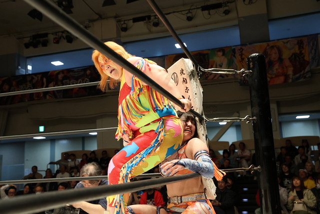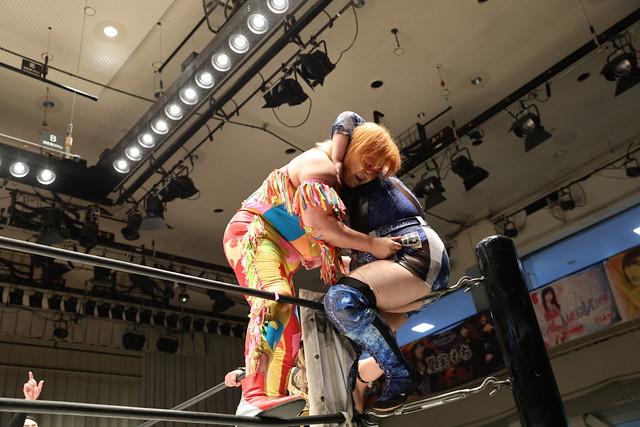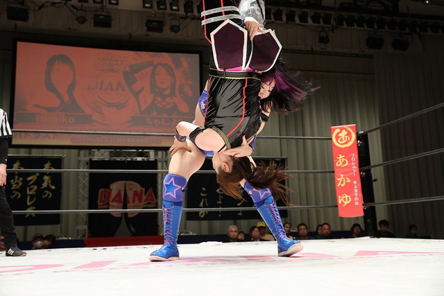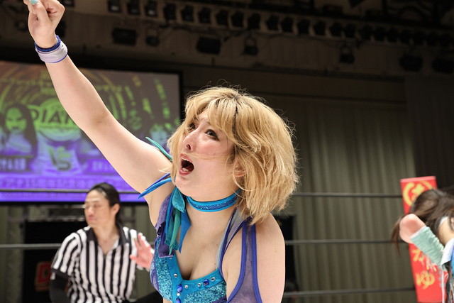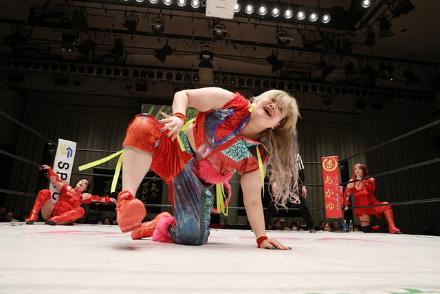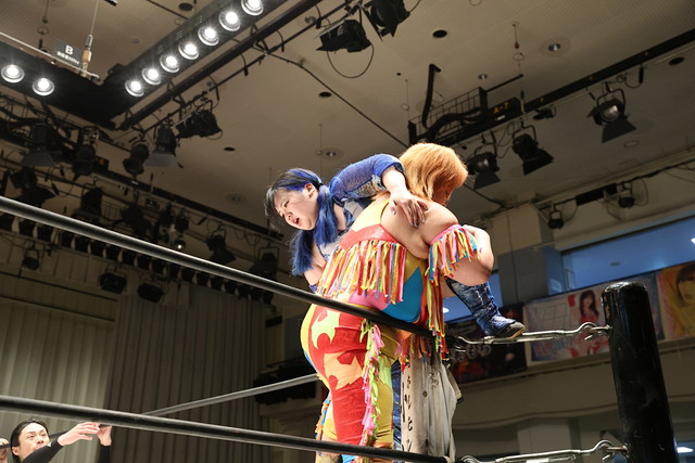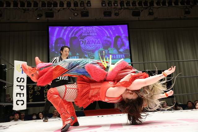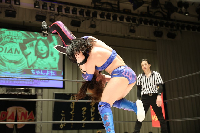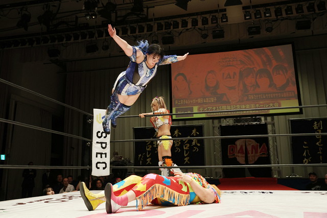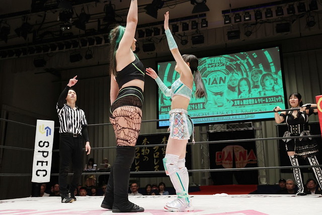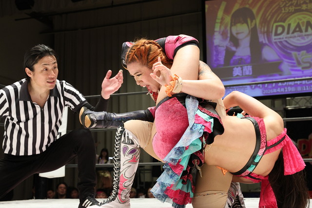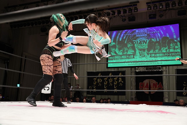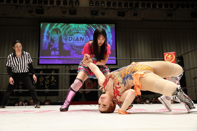 序盤はタバタのルチャならではの動きにしっかりついていき、ハイスピードな攻防で観客を沸かせる美蘭。低空ドロップキックで場外に落下させ、追撃のプランチャを発射。リングに戻ると619にハイキックと足技が炸裂。タバタは鎌固めでぐいぐい絞り、体勢を崩されてもクラッチを離さない。美蘭がエスケープすると今度はストレッチ技から素早く丸め込んで翻弄するタバタ。美蘭もクリストでギブアップを迫るがタバタも粘りを見せる。エスケープしたタバタは美蘭の蹴り足を掴むと、なんとそのまま担ぎ上げて後方にぶん投げる!超大技で観客の度肝を抜いたタバタだったが、続くムーンサルトはかわされ自爆に。今度は美蘭がライオンサルトで宙を舞い、クリーンヒット!ディアナ16年目は16歳の美蘭の白星で幕開けだ。