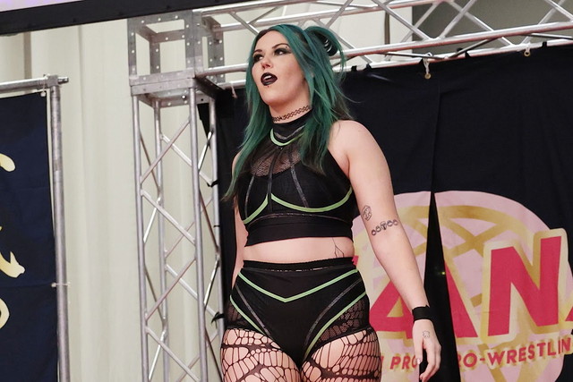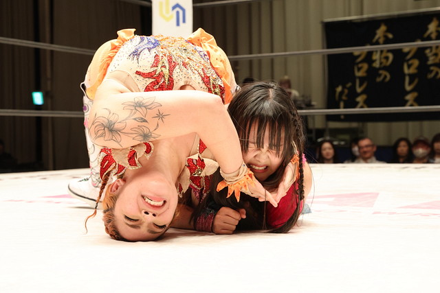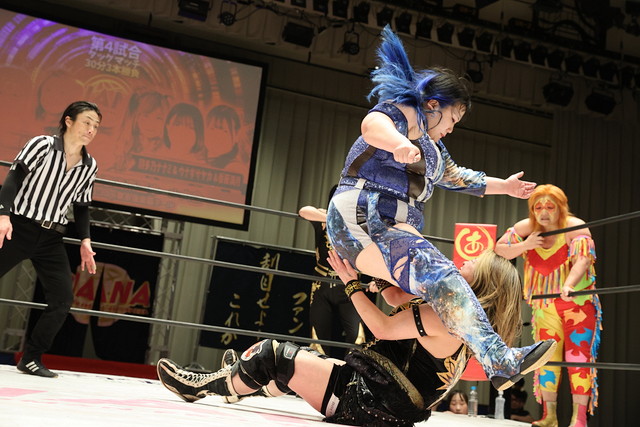 網倉とのシングルマッチは、Annaデビュー戦と同じカード。Annaにとっては昨年10月からここまでの成長をアピールする絶好のチャンスだ。まずはエルボーやドロップキック、クロスボディでAnnaが攻めまくる。しかし網倉には歯が立たず、キャメルクラッチで捕まってしまう。リング中央での逆エビ固めやボディスラムにわー!プレス、再びの逆エビ固めと、やられっぱなしのAnna。ど根性でエスケープするも、リング中央に引きずり戻されてしまう。なんとかエルボーで反撃するが、網倉は「まだまだ!」「来いよ!」と余裕の表情。奮起し気迫のエルボーを打ってくるAnnaに手応えを感じた網倉は「いいね!」。Annaのスクールボーイを返した網倉はカナディアンバックブリーカーで揺さぶる。それでもAnnaは音を上げず耐え抜くが、サイドスープレックスに沈む。敗れたものの約5ヶ月間の努力を網倉にしっかり刻み込んだ。網倉は「よくやった!Anna!」と笑顔を見せた。