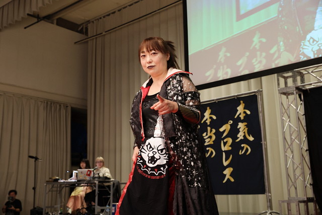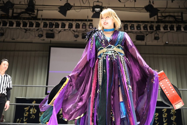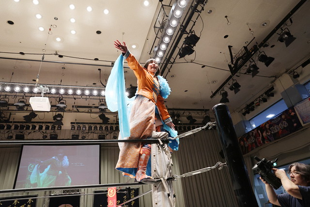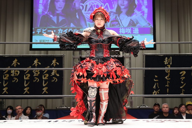 梅咲はタッグベルトを巻いて入場。勝てば二冠の大チャンスだ。この大一番でもアイドルレスラーらしい笑顔も見せる。対するデビーは入場時に観客の帽子を飛ばすパフォーマンスを封印。王者として迎えるビッグマッチを噛みしめるように真っすぐに花道を歩いて堂々のリングイン。梅咲とは対照的に、クールに観客席を見渡した。その視線の先には待望の横断幕も…。