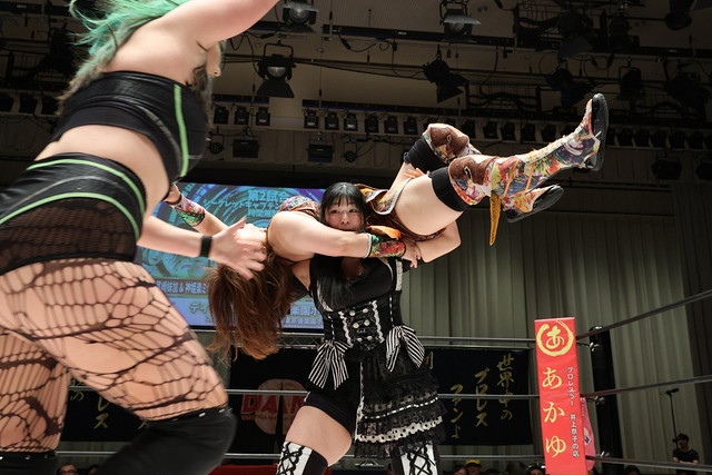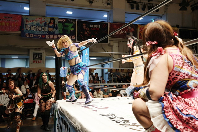 大会後は井上京子のお店「あかゆ」でのバースデーイベントを控えたデビー。勝って笑顔いっぱいの一日にしたいところだ。上機嫌に観客の帽子を飛ばしまくりながらリングイン。いつものデビーならレフェリーチェックは断固拒否だが、観客からソフト今井レフェリーに「がんばれー!」と声援が飛び、ファンの期待に応えるため(?)チェックを受け入れた。ただし、握手は断固拒否…。ゴングが鳴るとシングル王者とクリスタル王者の対決に。デビーがいきなりのサミングでブーイングを浴びるが、両者ハイスピードな攻防で会場を盛り上げる。Himikoがエプロンから美蘭を捕まえるとまたもブーイング発生。どこ吹く風で反則を繰り返すHimiko。美蘭はローンバトルを強いられ、再びデビーとのマッチアップ。デビーの串刺し攻撃をひらりとかわしてドロップキックで反撃し、ようやく美蘭から尾﨑にチェンジ。デビーのタックルやクロスボディを一歩も引かず受け止めた尾﨑はセントーンやラリアットでパワフルファイト。デビーもジャンピングニーやラリアットの打撃攻勢で反撃だ。デビーからタッチを受けたHimikoはギロチンを連続投下。尾﨑はアルゼンチンバックブリーカーでHimikoを担ぎ上げて揺さぶり、デビーにカットされるとサイドスープレックス。そのままHimikoを赤コーナーに連行して美蘭にチェンジする。美蘭はスピードの乗った619に低空ドロップキックで勢いづき、クロスボディを浴びせるが、これはHimikoが捕まえバックブリーカーに切り返す。そしてHimikoがデビーの新Tシャツで美蘭の首を絞める。仲間の新グッズをしっかり宣伝したところでデビーにチェンジ。デビーは串刺しビッグブーツにスライディングエルボー、ブレーンバスターと畳みかける。Himikoがまたしてもエプロンから美蘭の髪を掴んで動きを封じ、そこにデビーがジャンピングニー。尾﨑がラリアットでデビーをなぎ倒し、美蘭がライオンサルトで追撃。自力でキックアウトしたデビーはエスプレッソ抽出準備。持ちこたえた美蘭がハイキックでデビーの側頭部を撃ち抜き、世羅りさから受け継いだ花夢の山で丸め込む。Himikoのカットが間に合い、ピンチを凌いだデビー。ジャーマンでぶん投げ、トドメのヒザを突き刺しクリスタル王者を仕留めた。シングル王者は夏実もちとの防衛戦を1週間後に控えており、その先には既に挑戦の意志を表明している梅咲が待つ…。まだまだ負けられない戦いが続くが、ひとまず「あかゆ」でおいしいお酒が飲めたに違いない。