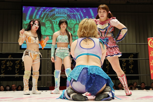 シークレットキャプテンフォールマッチは、キャプテンからスリーカウント・ギブアップ・オーバー・ザ・トップロープのいずれかを奪うまで試合が続行されるルール。キャプテンは試合前の抽選により、このカードで最もキャリアの浅いAnnaとキャリアの長い真琴に決定しているが、戦う選手たちには知らされていない…。実力だけでなく、運と駆け引きが求められる特殊ルールだ。真琴軍からは初登場のタリー、Anna軍からは唯一のディアナ所属としてAnnaが先陣を切る。タリーはオーストラリアから来日し、後楽園への参戦を「夢の旅」と表現。日本のプロレスの聖地で気合みなぎるタリー。Annaは骨折による欠場から復帰を迎え、こちらも気合は充分なはずだ。しかしタリー178センチにAnna155センチ20センチと、体格差は20センチ以上。キャリアはタリーが11年、Annaは半年…。本人達は全く自覚はないが、Anna軍はゴングが鳴る前から実は大ピンチに陥っている。試合が始まると、タリーが体格を活かして圧倒。ドロップキックを受けてもびくともせず、豪快なラリアット1発でAnnaを倒してしまう。タリーがフォールし、あわや試合終了かと思われたが尾﨑らがカット。タリーのヤバさを早くも思い知ったAnna軍はトレイン攻撃で集中砲火。しかし場外戦が勃発し、タリーがAnnaを捕獲しいたぶる。Annaも懸命に反撃するがタリーの重い打撃に苦戦。リングに戻ってもタリーが日本のファンの度肝を抜く怪力を発揮。お次はアメリカからやって来た筋骨隆々のマジカルガール・コスミックがラリアット。続いて実はキャプテンの真琴がカカト落としに真琴68kg!。そして網倉が「後楽園、いくぞー!」プレス。試合開始からずっとピンチの続くAnnaだが、パートナーのカットに救われ続ける。網倉へのドロップキックにクロスボディでようやく自力でピンチ脱出。鬱憤を晴らすように尾﨑と神姫楽がタックルの競演、神姫楽と炎華のWドロップキックと反撃開始。しかしタリーがラリアットで神姫楽と炎華を2人まとめてなぎ倒す。勢いに乗るタリーは雄叫びを上げトップロープへ。このままタリーの飛び技を察知した神姫楽と炎華が必死にロープを揺らし、タリーを落下させることに成功!OTRによりタリーの後楽園デビュー戦はこれにて終了だ。しかしキャプテンではなかったため、4vs3で試合続行!尾﨑と網倉が丸め込みでフォールの奪い合いになると炎華も加勢し、網倉からスリーカウント。すかさず真琴が抑え込んで尾﨑からスリーカウント。これで網倉と尾崎が退場になるが試合続行。コスミックが神姫楽をジャーマンスープレックスでフォールするが、神姫楽がうまく切り返して逆転フォール。これでコスミックもスリーカウントを奪われ失格となってしまう。真琴軍は立て続けにメンバーが脱落していき、残るは真琴1人に。つまり、キャプテンは真琴…!神姫楽、炎華、Annaの3人で真琴をタコ殴りに。真琴は「私には年老いたマネージャーがいるんです!」と新手の泣き落としにかかるが、それがどうしたと言わんばかりにAnna軍は真琴を狙い撃ち。年老いたマネージャーこと松澤さんが「やるなら私をやれ!」と受けて立つが、炎華がアッサリ蹴散らす。いくら百戦錬磨のベテラン相手とはいえ、数的有利の状況で負ける訳にはいかないAnna軍。トリプルドロップキックにイノシシムーブからトレイン攻撃とひたすら攻めまくる。真琴が思わず「誰か!助けて!」と叫ぶも、もう味方は誰もいない…。孤軍奮闘の真琴は神姫楽の突進をかわして城外へ落とそうとするが、真琴も押し出されてしまい両名エプロンに着地。そして真琴が雑巾を神姫楽に投げつけ、スカートめくりで翻弄(?)。気力みなぎるキックで神姫楽をついに落下させる!それでも2vs1のピンチはまだまだ続く。Annaと炎華が丸め込み攻勢で真琴のスタミナを削りWドロップキック。真琴はたまらずサードロープから場外へ脱出。と思いきやすぐに帰還。戻ってきた真琴を捕まえいたぶるAnnaと炎華。しかし真琴が顔を上げると…その正体は真琴のコスチュームを着た松澤さん!影武者作戦で意表を突いた松澤さんは目突きで2人の動きを止め、真琴へ勝利のバトンを渡す。真琴がAnnaをフォールするとすかさずカットに入る炎華。これを真琴がひらりとかわし、炎華とAnnaは同士討ちに。炎華を蹴飛ばし、Annaを全体重乗せオクラホマロールでフォールし大逆転スリーカウント!まさかの逆転劇に客席も大盛り上がり!崖っぷちの状況を見事ひっくり返した真琴軍+救世主・松澤さんは、弾けるような笑顔でリングをあとにした。