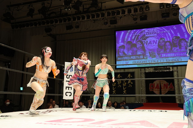 第一試合はT.Iから香藤、GoRから夏実、そしてユニット無所属の小林による3Way。まずは香藤が重さを活かしてパワーで圧倒。小林も自慢の筋肉をフル活用して応戦する。香藤と夏実は小林をロープワークで走らせスタミナを削る作戦に。倒れた小林に「どこのユニットの人ですか」と香藤が問いかけると「お前らこそどこだよ!知らねぇよ!こっちは久しぶりなんだよ!」と、しばらく参戦がなかったディアナのユニット抗争についてはご存じない様子。無所属のフリーランスでも、コサック脛蹴りで香藤をいたぶって存在感をアピールする。夏実も香藤の脛を蹴飛ばして排除し、小林との一対一に。全く動けない香藤をよそに熱い攻防を繰り広げる2人。夏実が小林をバックドロップでマットに叩きつけてフォールすると、ようやく回復した香藤がおまんじゅうプレス!夏実は回避し、食らった小林はたまらず場外へ転げ落ちてしまう。香藤が夏実にダイビングおまんじゅうプレスを投下するも、夏実にかわされ自爆に。ギブアップ寸前までダメージを負ってしまう。何とかエプロンまで戻ってきた小林が「ギブじゃねーの?!」と横槍を入れるも、夏実のロープワークで再び落下。香藤が夏実も落下させ、みたらし団子で2人まとめてぺちゃんこに。夏実をリングに放り込んだ香藤は、今度こそダイビングおまんじゅうプレスで103キロの体重を浴びせる。苦しい展開の夏実はもっちりバディシザーズで逆転を狙うがカウント2。そこに復活した小林がトップロープから鮮やかなダイビングクロスボディを発射!2人を一気になぎ倒した小林は、香藤を捕まえ電光石火の120%スクールボーイで分厚い体を押さえきってスリーカウント!「お前のユニットに入れろ!」「お前のユニットか?!」と化け物のように周囲のレスラーを襲いながらリングをあとにした…。小林のユニット加入はあるのか?