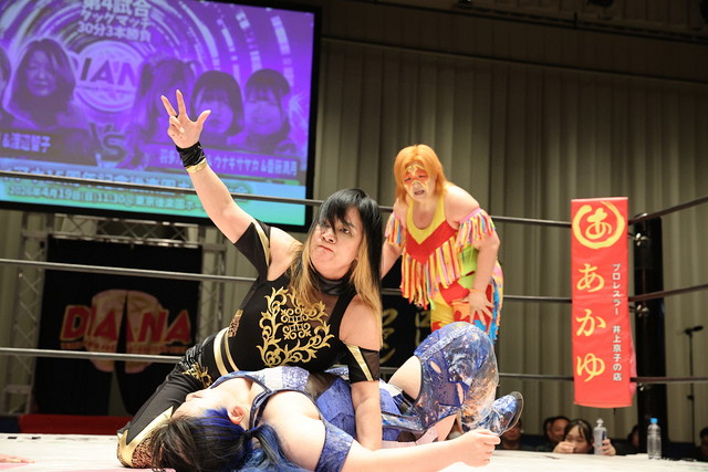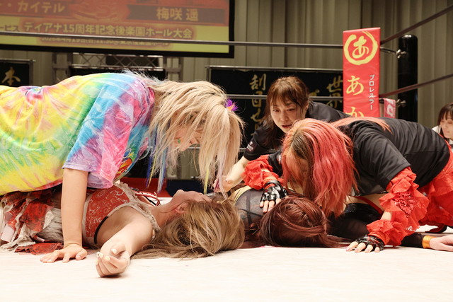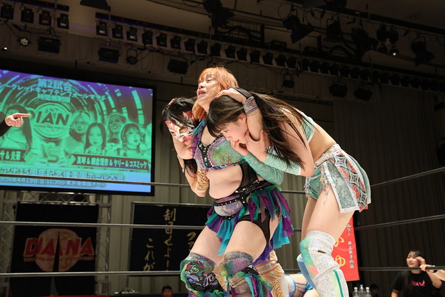 先発はHimikoと美蘭。年の差はあるものの、ディアナ生え抜きの同期対決だ。まずはHimikoが試合の主導権を握るが、美蘭もクロスボディを一発お見舞い。美蘭から神姫楽に代わると、INVAが反則を駆使して神姫楽を捕まえる。INVAをやはり野放しにしてしまう今井レフェリーに美蘭は「おい!おじさん!」と怒りを露に。Himikoからタッチを承けた佐藤は得意のチェーンレスリングをじっくりと展開。神姫楽の髪を踏みつけ、負傷している右膝を狙うなど、無慈悲に攻めまくる。佐藤が4の字固めで神姫楽の動きを止め、そこにHimikoがギロチン投下。そしてHimikoが好評発売中のTシャツで神姫楽の首を絞める。美蘭は「誰が欲しいんだよそんなの!誰もいらねーよ!」「おい!今井!チェック!」とヒートアップ。苦しいローンバトルを強いられた神姫楽は力を振り絞って逆エビ固めや変形パロスペシャルでようやく反撃。佐藤がなかなかカットに入れず、Himikoは「佐藤!佐藤ー!!」と大先輩を呼び捨てて助けを待つ…。Himikoをギブアップ寸前まで追い込んだ神姫楽はGoRの連続ドロップキックでさらなる追い討ち。そして佐藤にもGoRドロップキック挟み撃ち。勢いづくGoRは神姫楽から美蘭にチェンジ。美蘭はコーナーから飛び付いてヘッドシザーズホイップで鮮やかに佐藤を投げ飛ばし、素早くクリストで絞る。ロープを掴んだ佐藤に低空ドロップキックで追撃するが、佐藤がWアームスープレックスで反撃してチェンジ。Himikoはクラシカルにサソリ固め、美蘭は軽快に619と、それぞれの持ち味を活かした攻防に。そして美蘭がドロップキックを四方から浴びせていくと、事件が発生。大の字で倒れたHimikoが全く動けず、その様子を見た佐藤は慌ててタオルを要求。今井レフェリーも「止めるよ?」とレフェリーストップを示唆。心配した美蘭が近付くと、Himikoは「そんなわけねぇだろ!」と起き上がって美蘭の髪を掴む。54回目のバースデーを目前に、大人げない戦法で16歳を仕留めにかかる。Himikoがフォールされると佐藤がおぼんを投げつけてカットするなど、こちらも大人げなくやりたい放題。「エースクラッシャー!」と技名を宣言し19分22秒、熱戦を制した。
