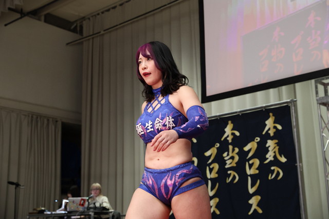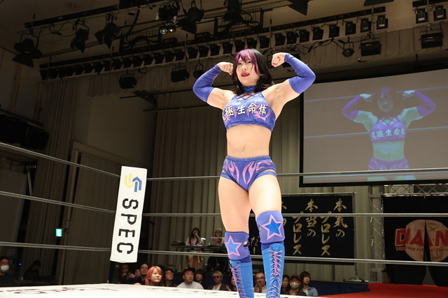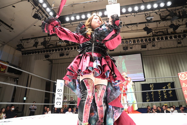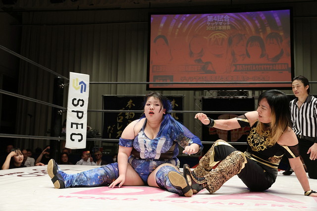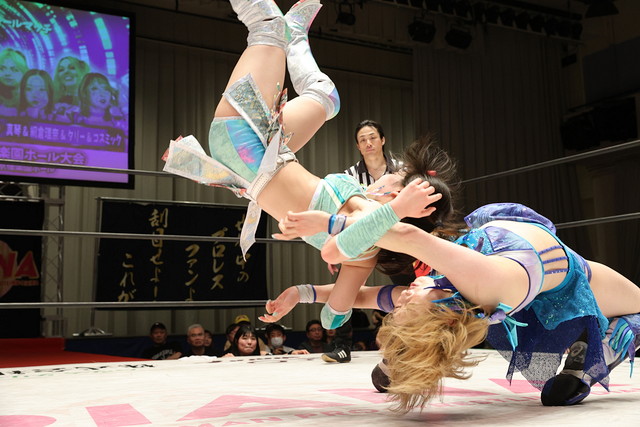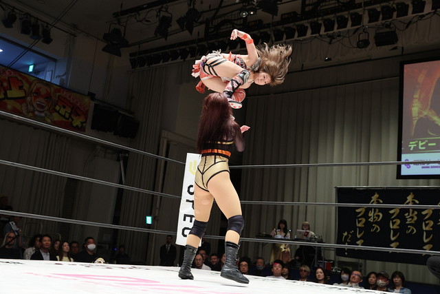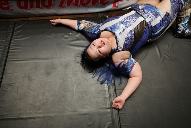新木場大会でAnnaの代打として緊急参戦したコスミックが今回も登場。いきなりのタックル合戦では柊が上回り、「はじめまして!」とあいさつ代わりのフットスタンプ。あまりにも強すぎてブーイングを浴びてしまう柊だが、まったく意に介さず腰を落とした逆エビ固め。もがいてロープを掴んだコスミックにはフットスタンプで追撃。余裕綽々の柊に対し、力強いエルボーや変形ヘッドシザーズホイップ、タックルと反撃するコスミック。バックを取ったが、これは柊が投げ落として連続フットスタンプで逆襲。完全に試合の主導権を握った柊がミサイルキックでコスミックを吹っ飛ばす。コスミックが豪快なスープレックスで柊の巨体をぶん投げるとファンは拍手喝采。さらに変形フェイスクラッシャーでフォールするがカウント2。ファンの手拍子に押されコーナーに上ったコスミックだったが、柊が投げ落としキャノンボールで圧殺。大ダメージを受けたコスミックに「まだまだ!」とダイビングフットスタンプを突き刺し、豪快なラリアットでトドメを差した。