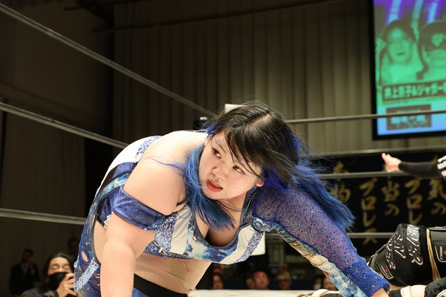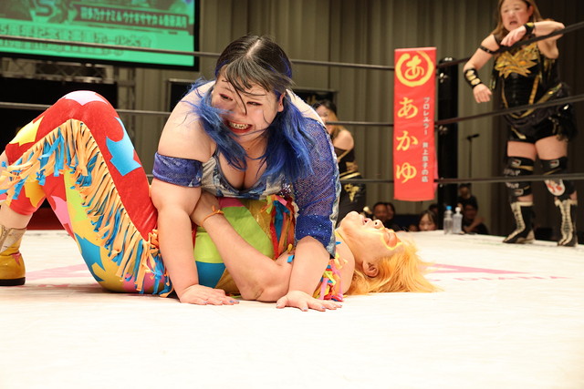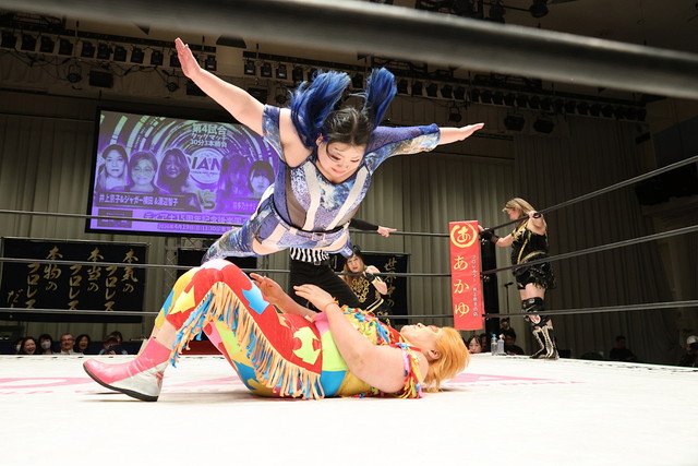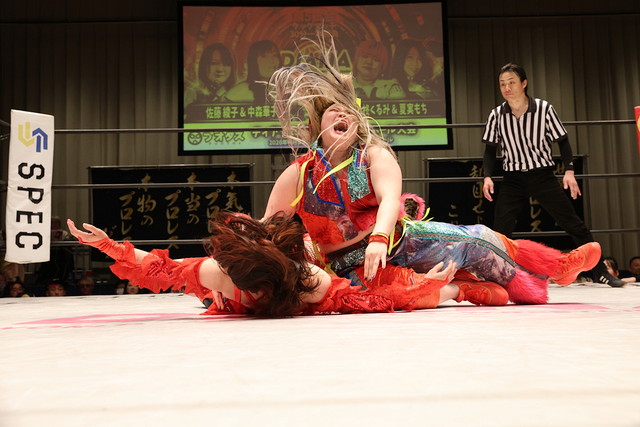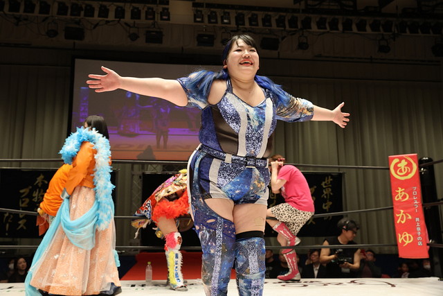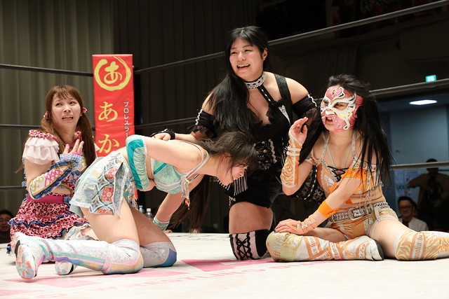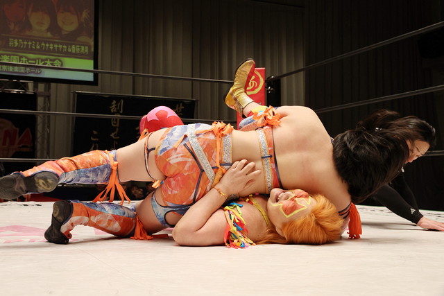 ナナミプロデュース大会のメインはTradition&Inheritedのメンバーによるスペシャルタッグマッチ。まずはにじゅうまるがタックルで突撃するが、体格で上回る京子と香藤が迎撃。そして前日は仙女刈谷大会で会場を爆発させた(?)香藤がホーム・アミスタでも大暴れ。網倉を何度も何度も踏みつけ、さらに大声でギブアップを迫る。今井レフェリーも思わず「うるさいよ!」。京子もモンゴリアンチョップで網倉を狙う。網倉がWチョップをお見舞いし、逃げるようにナナミにチェンジ。ナナミが京子をコーナーに追い込んでいくが、京子はあっという間に形勢逆転。ナナミを赤コーナーに連行して香藤にチェンジすると、香藤と京子がナナミを踏みつける。なんと合計体重は213キロ!ナナミはギブアップ寸前まで追い込まれてしまい、さらに香藤がみたらし団子で追撃。香藤の重さに大苦戦のにじゅうまる。ここで京子は早くもナイアガラ宣言!網倉が慌てて飛び出して食い止め、ナナミがスリーパーで京子を絞め落としにかかる。持ちこたえた京子に網倉がセントーンやボディプレスを連続で投下。そして網倉が逆水平チョップを放つと、かつてない破裂音が!観客がざわめく中、京子は「効いてない!」と意地を張るが、マシンガンチョップを浴びると大ダメージ!この勢いで網倉が111キロの京子をカナディアンバックブリーカーで揺さぶる。これは香藤が優しめにカットするが、網倉は攻め手を緩めずタックルで突撃!ナナミも「あーみん!負けんな!」と加勢し、2人で矢継ぎ早に京子めがけてタックル。そしてWタックルでついに京子の巨体を倒し、試合はにじゅうまるのペース…かと思いきや、そうはさせないのが天才レスラー。反撃の両腕ラリアット一撃でにじゅうまるをまとめてなぎ倒す。そしてタッチを受けた香藤もクロスボディやカナディアンバックブリーカー、串刺しバックエルボーとパワフルファイト。しかしダイビングボディプレスはナナミがデッドリードライブで阻止。網倉もダイブを狙うが、これは京子が雪崩式ブレーンバスターで撃墜。バウンドして対角コーナーまで飛んでいった網倉に、香藤が今度こそのダイビングボディプレス!大ピンチに陥る網倉。京子がナナミをガードし、香藤はチャンス。しかし網倉は力を振り絞り、102キロの香藤をサイドスープレックスで投げ飛ばす。そしてにじゅうまるの息ぴったりの連係で京子を排除し、香藤を捕まえる。香藤にナナミのダイビングボディプレス、網倉がダイビングセントーンを続けて発射!京子が「返せ!返せ!」と場外から叫ぶが、香藤の肩は上がらず…。にじゅうまるが同門対決を制し、劇的勝利を収めた。