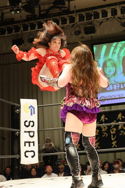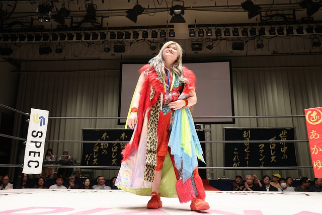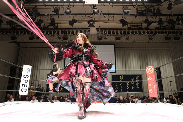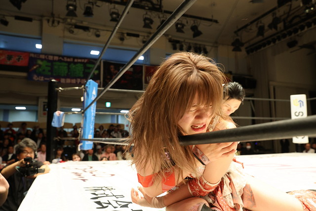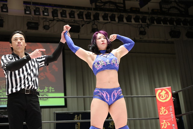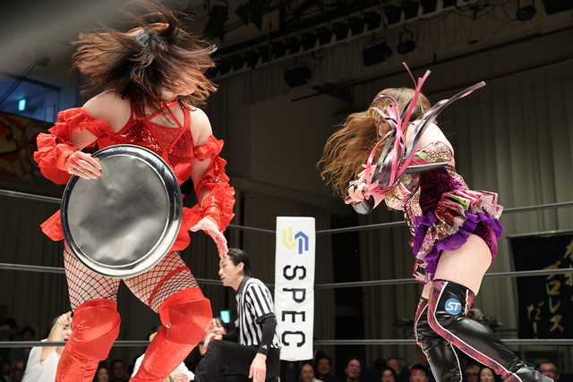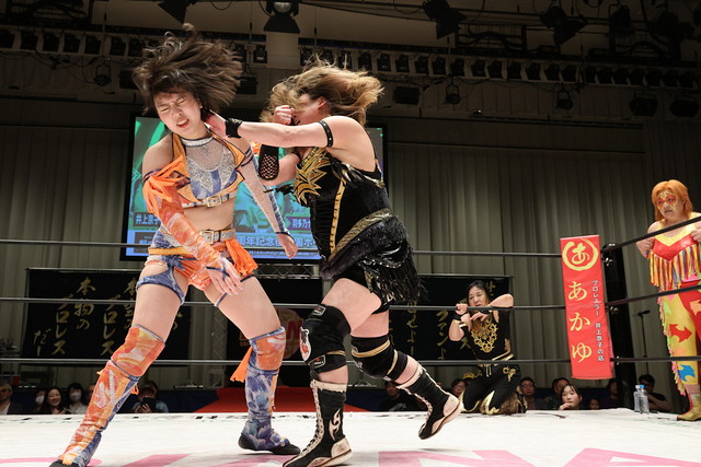 試合前には神姫楽ファンの夫からLINEで「ミサちゃんによろしく」と言われてしまった佐藤だが、いざゴングが鳴ればそんなことは関係なし!まずはじっくりと互いの手の内を探り合うように、そして力を確かめ合うようにチェーンレスリング。分が悪くなると噛み付いて脱出するなど、“がむしゃらプリンセス”ぶりを発揮する神姫楽。対する佐藤は神姫楽を巧みにコーナーに追い込み、ヘアホイップで投げ飛ばす。神姫楽も負けじとヘアホイップをお返し。神姫楽ががむしゃらに突進すれば佐藤は磨き上げたテクニックで反撃…と両者がそれぞれの持ち味を活かす好勝負に。佐藤のWアームスープレックスを持ちこたえた神姫楽はタックル連発で佐藤を吹っ飛ばす。コーナーを背負ってしまった佐藤だが、イノシシムーブから突撃してくる神姫楽をおぼんで迎撃!おぼん攻撃から波に乗りたい佐藤はコーナー最上段へ…しかしおぼんを拾った神姫楽が佐藤の脳天を殴打!逆に勢いづく神姫楽は豪快なラリアットでフォール。佐藤の肩が上がると神姫楽ははれときどきミサを投下するが、かわされ自爆に。佐藤はこの隙を逃さず佐藤トランペット。返した神姫楽は佐藤をロープに振るが、佐藤がカウンターの飛び付きレッグロールクラッチ「佐藤100%」で鮮やかにスリーカウント!佐藤一家も100%大満足な一戦となったはず?