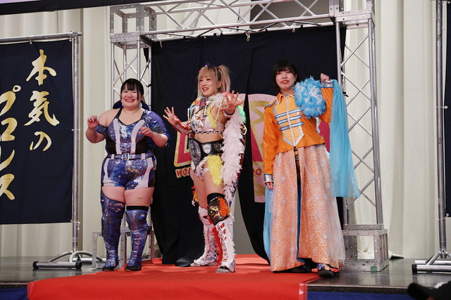 Tradition and Inherited対Grace of Royalty…のようでそうでない3人。梅咲は炎華をGoRへ勧誘することを予告している。まずはその梅咲と香藤がマッチアップ。香藤のパワーに連係で対抗する梅咲軍。そして香藤を3人がかりで捕まえると「炎華ちゃん!本日よりGrace of Royaltyに加入するぞー!」と宣言。勧誘すると予告してはいたが、既に加入は決定事項だった?炎華はやや困惑しながらも笑顔。観客からは「おめでとう」コールも。晴れて初のユニット加入(?)が決定した炎華に、早くも試練が。香藤からタッチを受けた京子の猛攻を受ける。さらにT.Iの3人によるヒザ攻め、柊の連続フットスタンプと試練は続く。これにはユニットリーダーの梅咲も思わず目をそらす…。まだまだ試練は続く!T.Iの3人が次々と炎華を踏みつけ、京子が高速ブレーンバスター!そして炎華1人に111キロの京子、102キロの香藤、90キロの柊が一度に乗っかり、合計303キロで踏み潰す。炎華得意のティヘラを持ちこたえた柊がサイドバスターに切り返して叩きつける。ここで梅咲が飛び出しドロップキックで助太刀。今度こそティヘラで柊を投げ飛ばし、ようやく尾﨑にチェンジ。香藤が柊に加勢すると、GoRも梅咲が好アシスト。両軍鮮やかな連係から、尾﨑と柊のパワー対決に。柊がド迫力のミサイルキックで尾﨑を吹っ飛ばし、京子にチェンジ。尾﨑と京子もラリアットで激しい肉弾戦を展開し、尾﨑が京子をアルゼンチンバックブリーカーで揺さぶる。香藤がカットに入り、尾﨑から梅咲にチェンジ。団体の社長とエースによる対決は、梅咲は強烈なエルボー、京子は豪快なラリアットと熱い打撃戦。タッチを受けた香藤はおまんじゅうプレス連続投下で梅咲をぺちゃんこに。梅咲もランニングネックブリーカードロップや低空ドロップキックで軽やかにお返しだ。香藤と炎華の同期ライバル対決は炎華がスピードを活かして攻めまくり、香藤も重さを活かして押し潰す。炎華は京子の雪崩式ブレーンバスター、柊のフットスタンプ、香藤のダイビングおまんじゅうプレスとT.I怒涛の連続攻撃をなんと自力でキックアウト。ならばと京子と香藤がサンドイッチタックルで突撃するが、炎華がかわして誤爆に。ふらついた香藤に、炎華がジャパニーズレッグロールクラッチ!大逆転のスリーカウントだ。