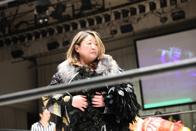 セミファイナルはにじゅうまるにジャガーが加わる強力トリオに対し、炎華が加わったGrace of Royaltyが初陣。その炎華を序盤に捕まえたジャガーが反則に次ぐ反則で逃さない。網倉とナナミも加わり、炎華は苦しい時間が続く。ようやくローンバトルを脱出して尾﨑にチェンジすると、網倉と尾﨑の迫力の攻防。網倉はサイドスープレックスで尾﨑を投げ捨てジャガーにチェンジする。ジャガーには尾﨑と神姫楽の2人がかりで向かっていくが、ジャガーがサミングで迎撃。神姫楽のイノシシムーブからの突撃も踵落としで打ち砕く。そして神姫楽をなんと雪崩式ブレーンバスターで投げ落とす!64歳とは思えぬ超人ぶりを見せつける。ジャガーが作ったチャンスにナナミが飛び出し、神姫楽と激しいぶつかり合いに。ナナミがタックルで倒せば神姫楽はラリアットで倒す。ここで神姫楽からタッチを受けた炎華だが、ナナミのタックルやにじゅうまるの合体スープレックス、ナナミのフィッシャーマンズスープレックスと連続攻撃を浴びてしまう。GoRは尾﨑がカウンターでスパインバスター、神姫楽のはれときどきミサ、炎華がミサイルキックとユニットの総攻撃で応戦。するとジャガー軍も波状攻撃に出る。網倉がラリアットで尾﨑と炎華をまとめてなぎ倒し、炎華に狙いをさだめたジャガーがJカッター。ナナミがノーザンライトスープレックスで勝負を決めた。