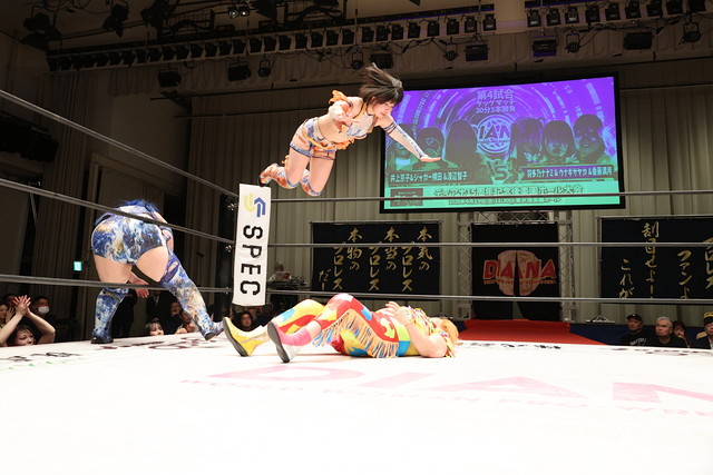 まずはナナミとHimikoがチェーンレスリング。Himikoがサミングでナナミの動きを止め、中森とのW攻撃。ナナミをロープにはりつけると、Tシャツを使ってナナミの首を絞める。にじゅうまるもW攻撃で対抗し、両軍早くも抜群のチームワークを発揮する好勝負。網倉をブルドッギングヘッドロックでマットに叩きつけたHimikoから中森にチェンジ。中森得意のキックに網倉はチョップをお返し。中森をサイドスープレックスで投げ飛ばし、網倉からナナミにチェンジ。ナナミはボディアタックやタックルで突進していき、中森はヒザ蹴りやシャイニングウィザードと足技が炸裂。中森からHimikoにチェンジすると、ディアナ所属の2人が白熱の攻防を展開。中森がHimikoをアシストすれば、網倉もナナミの助太刀に入る。中森がハイキックでナナミの側頭部を打ち抜きふらつかせると、すかさずHimikoがアバランシュホールド。INVAとしてタッグを組む機会も増え、コンビネーションが高まってきた2人に対し、にじゅうまるもナナミのピンチには網倉が飛び出す。網倉のカットに救われたナナミはブロックバスターでダイナミックに弧を描く。返したHimikoは高さのあるバックドロップで応戦。中森を振りほどいた網倉がボディスラムでHimikoを設置し、ナナミがダイビングボディプレス。これは中森がカットしカウント2。Himikoはナナミのえびす落としを自力で返すド根性を見せ拍手喝采を浴びるが、続くノーザンライトスープレックスでフィニッシュ。激闘を制したのはにじゅうまる!一つ一つの白星を積み重ね、目指すはタッグ王者だ。