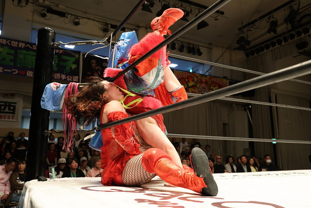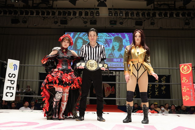 ゴングが鳴ると早くも梅咲がエルボー連打で猛攻。するとデビーは梅咲をリング外へ投げ飛ばし、得意のラフファイトに持ち込む。デビーは場外でも構わずブレーンバスターで梅咲を床に叩きつける。そしてパイプ椅子に梅咲を座らせ、充分な助走からビッグブーツ!椅子ごと梅咲を吹っ飛ばす。ヒートアップする2人は南側観客席へ。ファンの目の前で激しい攻防を繰り広げる。階段からのプランチャで梅咲が形勢逆転。しかしダメージの大きい梅咲はリング上でリードを保てず、デビーが優位に。デビーはデス・トラップで捕まえて離さず、なかなかエスケープを許さない。何とかロープに足が届いた梅咲はヘッドシザーズホイップでデビーを投げ飛ばす。得意の低空ドロップキックを突き刺し、続けてミサイルキックも発射。そして足4の字固めでデビーの足技封じだ。悶え苦しむデビー。ロープに届きはしたが、受けたダメージは明白だ。梅咲はデビーがヒザを押さえるのを見逃さず、膝めがけてストンピングやエルボードロップを落とす非情な攻め。デビーはカウンターのブロックバスターで梅咲をコーナーに追い詰め、痛みを堪えながらランニングWニーアタックを突き刺す。そしてビッグブーツを連発。得意の足技を繰り出していくが、梅咲の足攻めがじわじわとデビーを蝕む。普段の余裕綽々なデビーとは違う、痛みや苦しみが表情に滲む…。時折膝を押さえながらも自身のスタイルを崩さず蹴りまくるデビー。梅咲はまたも膝にヒジを落としていく。それでもまだまだ蹴りまくるデビーに梅咲は「来いよ!」と声を荒げる。デビーも日本語で「来いよ!」と呼応する。梅咲が得意のエルボーで勝負に出ると、デビーも得意のエルボー。梅咲が滞空時間の長いブレーンバスターでフォールするがカウント2。攻め手を緩めず突進する梅咲の勢いをうまく利用し担ぎ上げ、真上に放り投げて膝で迎撃するデビー。リスクもリターンも大きい技で両者ダウン状態に。先に立ち上がったのは王者だ。右足を引きずりながら梅咲の髪を鷲掴みにして起こし、エスプレッソ抽出準備。これは梅咲が丸め込みに切り返し、ラ・マヒストラルで逆転を狙うがカウント2。ならばと初披露の変形STFでぐいぐい絞り、王者を極限状態まで追い詰めていく挑戦者。これまでは介入を繰り返してきたINVAメンバーも「ロープ近い!」「動け!」とデビーの勝利をただ信じて、リング外から声を枯らす。デビーが仲間に導かれるようにロープを掴み、梅咲はトップロープへ。デビーも追っていき、2人はコーナー上でエルボーの打ち合いに。渾身の一撃を食らいふらついたデビーだが、足がセカンドロープに残り持ちこたえる。そこに梅咲がフットスタンプを投下しデビーをマットに突き刺し、さらに梅スプラッシュで追撃。これを返したデビーは拳を握りしめ己を奮い立たせる。デビーも梅咲の足をロープにかけてのスタナーで反撃し、フロントスープレックス。梅咲は投げ捨てるようなキューティースペシャル。両者一歩も退かない大熱戦に、観客席からは手拍子が自然発生。その中でデビーが必殺エスプレッソ抽出。そのままフォールするが、梅咲はエビ固めに切り返す。デビーは飛び込んでニーアタック、今度は切り替えされぬよう力強くエビ固めで押さえるが梅咲がしぶとくキックアウト。そして梅咲の足をセカンドロープにかけてのエスプレッソ。これも梅咲がキックアウト。諦めないセンターの意地、譲れない王者の意地が激しく火花を散らす。デビーはW.W.W.Dシングル戴冠のフィニッシュとなったタイガースープレックスの構え。梅咲はこれもカサドーラに切り返し、バックを取ると投げっぱなしジャーマン!そしてジャーマンスープレックスホールドで鮮やかにブリッジ。今井レフェリーがマットを2回叩くと、デビーのプロレスラーとしての本能が肩を押し上げる。挑戦者は再びバックを取り、王者の右腕と左足をクラッチ。そして雄叫びをあげながら力を振り絞って後方にぶん投げる。デビーへの思い、二冠への夢、センターとしての信念…これまでの全てを乗せたブリッジでフォール。19分46秒、今井レフェリーがマットを3回叩いても起き上がれず、デビーはついに力尽く。梅咲遥が“ブラスト”の名の通り爆発のような一撃で宿敵を葬った。セコンド介入も反則もなく、持てる力を出し切った2人を、ブーイングではなく大きな拍手が包み込んでいた。