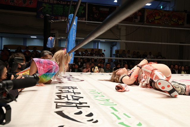 奇襲から場外戦を仕掛け、セコンド介入に珈琲毒霧噴射…とタイトルマッチでも相変わらず狂乱ファイトのデビーに、夏実はブチギレ!梅咲も怒りを滲ませ、デビーに掴みかかる。夏実陣営がレフェリーに猛抗議しようが何をしようが、“第23代王者が2度目の防衛に成功”の事実は変わらず。王者はクールにベルトを掲げ、リングを後にする。かつてデビーが乱入し余韻をぶち壊したように、バッドエンドで新木場大会は幕を閉じた。
